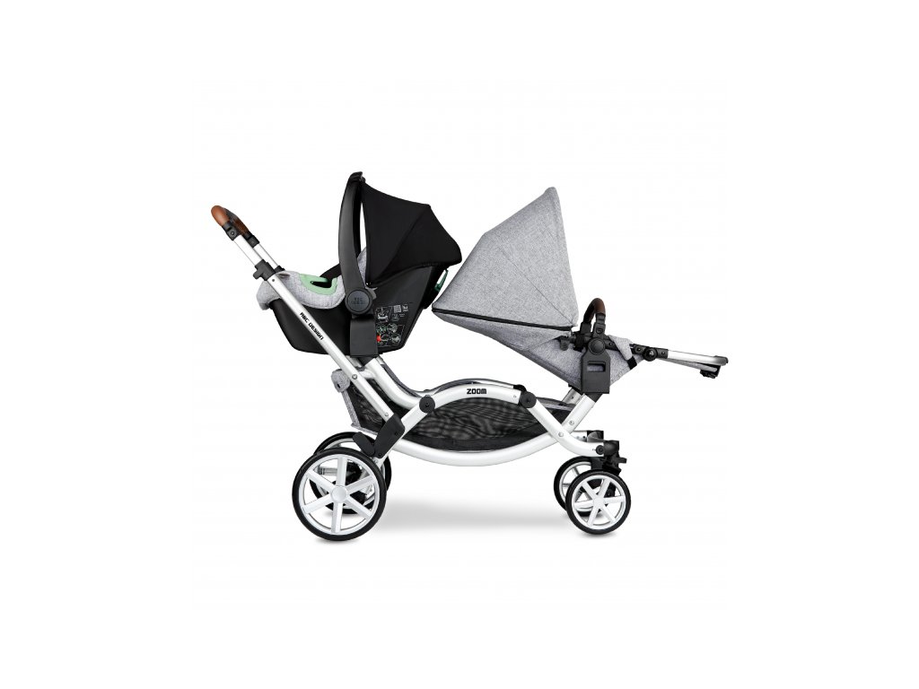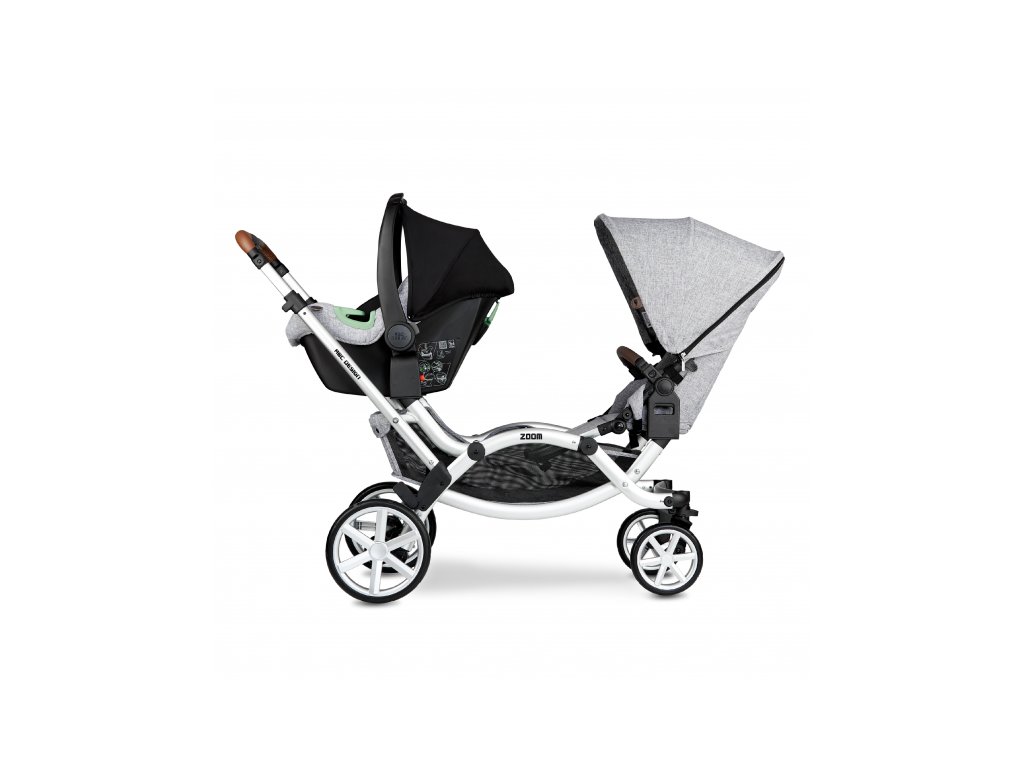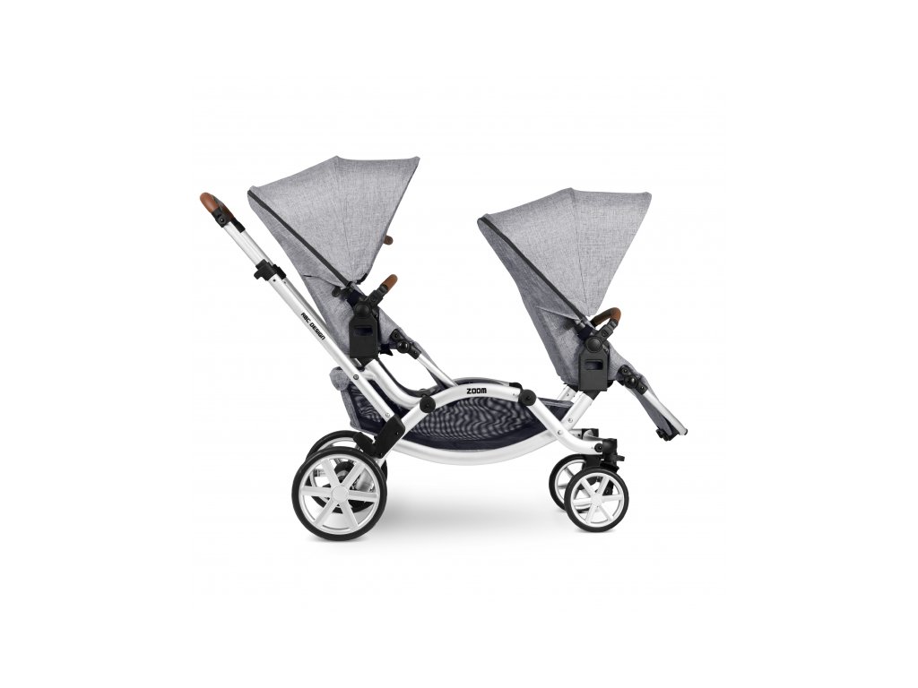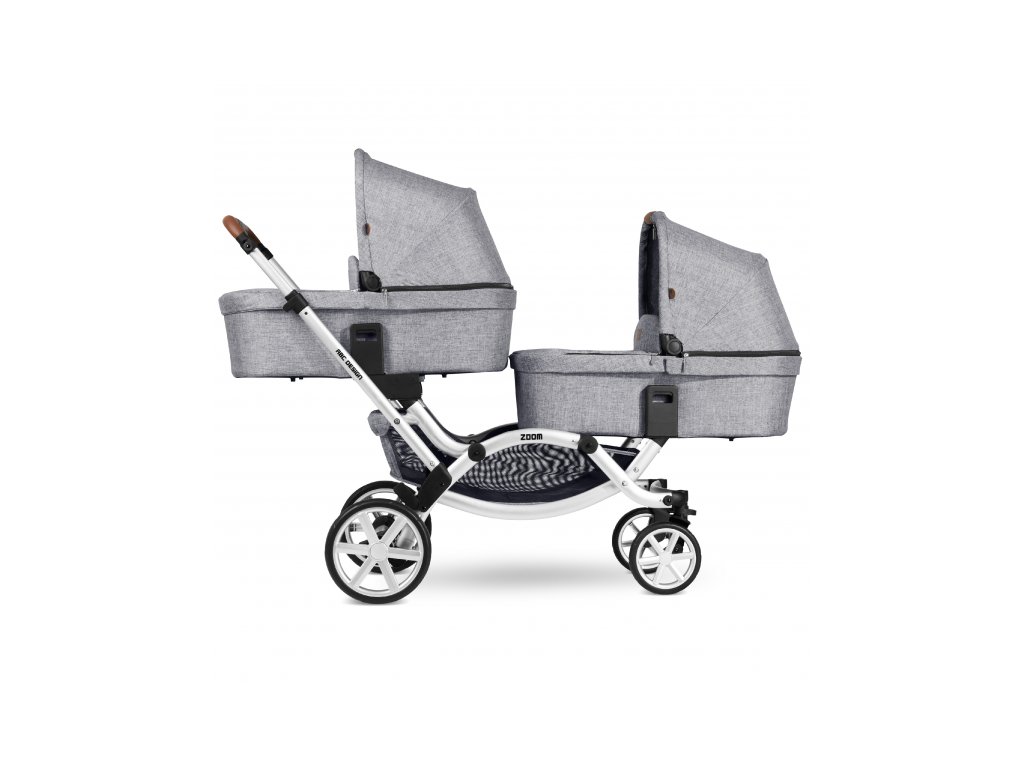Dvojnásobné štěstí s sebou ale přináší také nové výzvy. Význam dětského kočárku v každodenním životě rodiny je tak důležitější než kdykoliv předtím. Kočárek Zoom vám pomůže zachovat si svobodu a flexibilitu, která je pro vás tak důležitá. Podle věku dětí můžete libovolně kombinovat sportovní nástavbu, korbičku a autosedačku. Díky otočným kolům je kočárek Zoom velmi snadno ovladatelný a jeho kompaktní design si skvěle poradí i s úzkými prostory. Pomocí několika pohybů jej lze proměnit na cestovní systém a nebo složit do minimálních rozměrů. Pro vaše děti bude kočárek Zoom tím nejkrásnějším místem, odkud budou moci společně objevovat svět. Během jízdy se na sebe mohou dívat, společně se smát, pozorovat vás nebo jen tak sedět a zkoumat okolní svět.