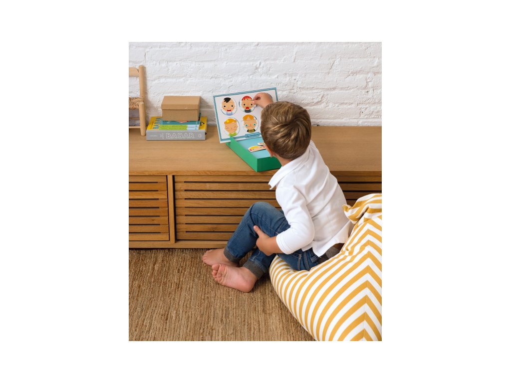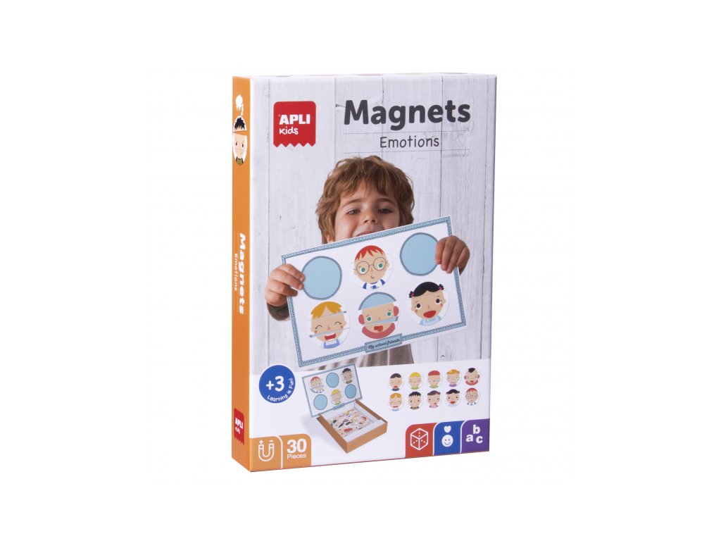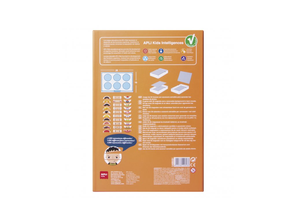 Každá hra obsahuje: 1 magnetické pole o rozměrech 28 x 18 cm, které sedne na spodek krabice a 30 magnetů s různými emocemi.