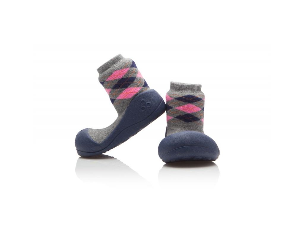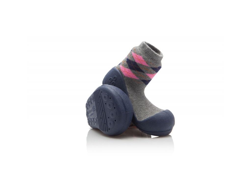 Univerzální botičky Argyl Navy se budou líbit jak holkám, tak klukům. Silnější ponožka v šedo-růžovém provedení s tradičním anglickým vzorem Vás přenese k teplému anglickému krbu. Tmavá praktická podrážka se nebude příliš špinit při nošení venku.