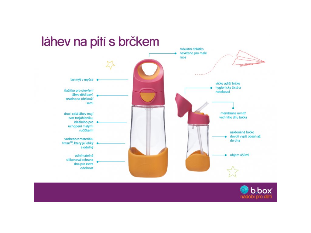 Už jsou velcí na hrníček s brčkem? b.box má pro ně bezvadnou lahvičku! Do školky i do školy, na hřiště i na výlety, naší tritanovou lahvičku můžete mít všude sebou. Ergonomický tvar s trojúhelníkovou základnou padne skvěle do drobných ručiček vašich dětí. Silikonové brčko dovolí vypít z lahvičky i tu poslední kapku :-) a víčko má držátko pro snadné nošení nebo zavěšení na batoh, kočárek apod. Lahvička se po snadném zmáčknutí "tlačítka" lehce otevře.