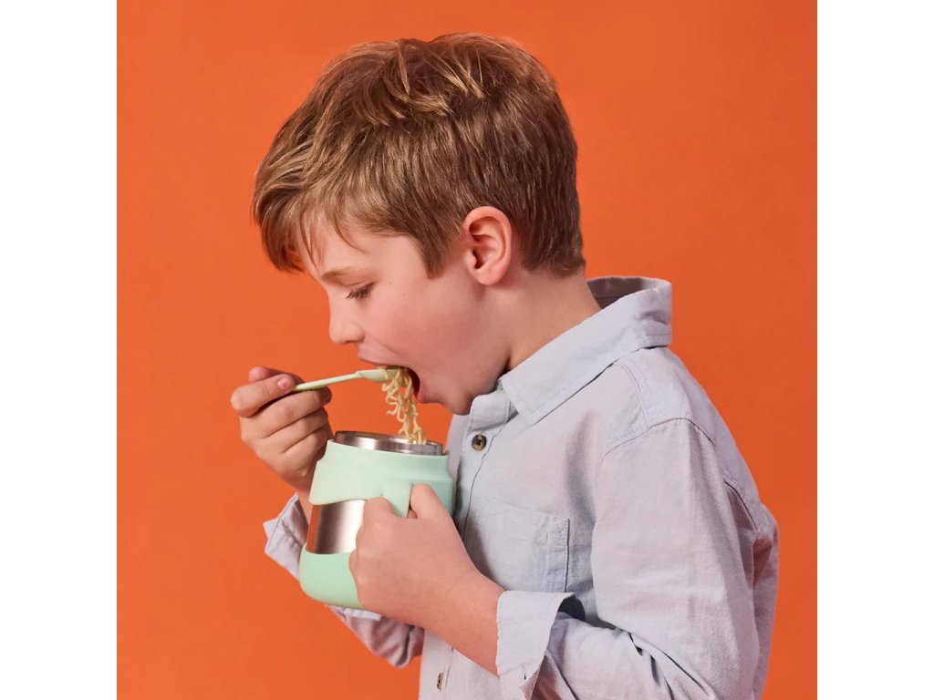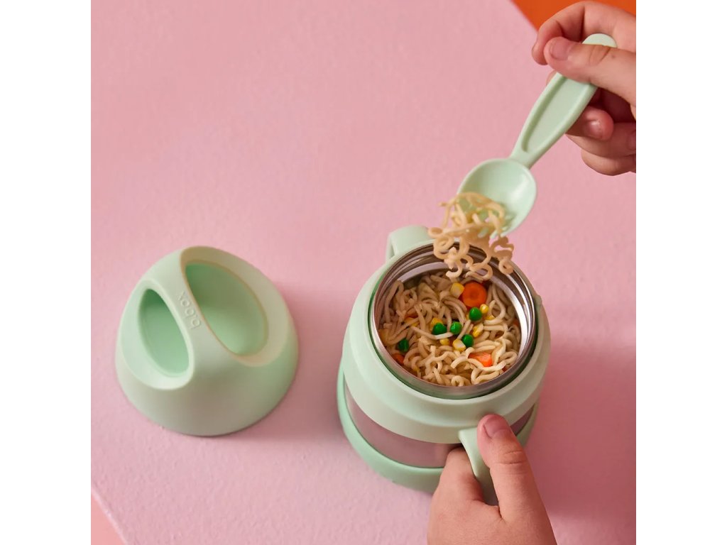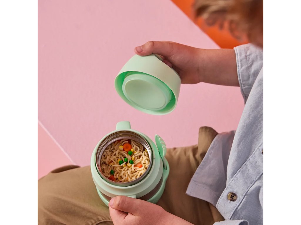 Široké hrdlo termosky umožní, aby malé ručičky dosáhly na poslední sousto na dně. Na víčku je "ouško", za které je možné termosku nosit nebo zavěsit na karabinu. Kromě toho je toto "ouško" skvělé i pro slabé nebo malé ruce - vložením prstů do otvoru a pootočením lze využít "páky" a tak je otevření snadné jak pro děti, tak i pro starší lidi. Ucha po stranách termosky i kryt chránící dno termosky z venku jsou odnímatelné. K termosce je možné dokoupit náhradní vidličko-lžičku.