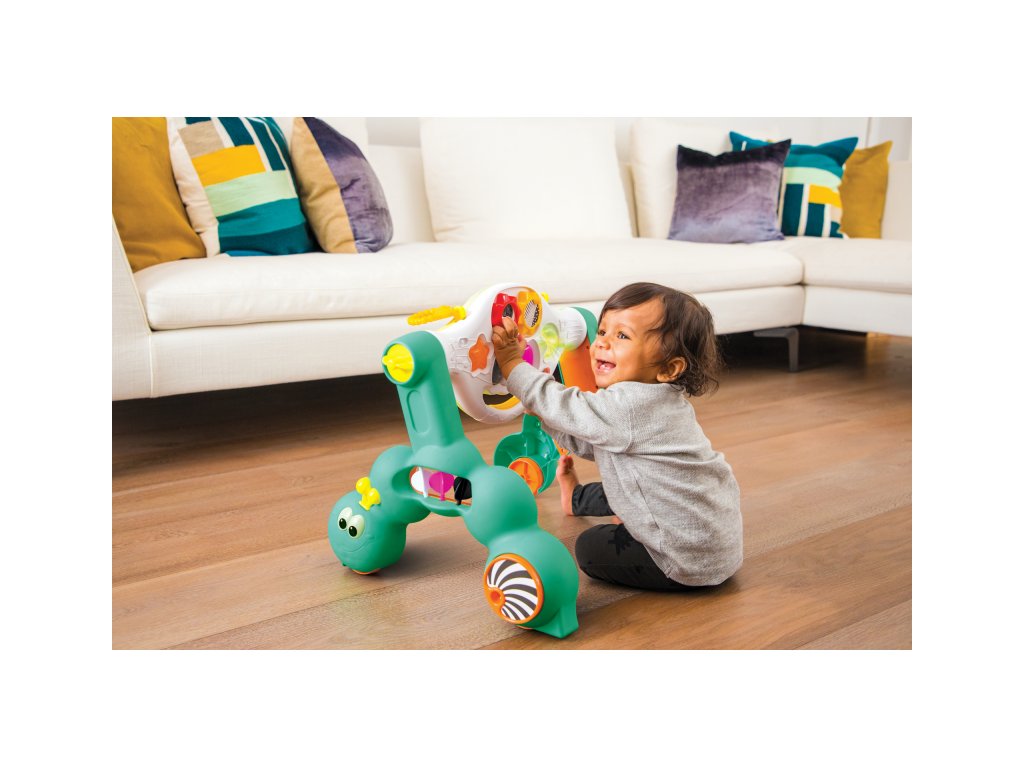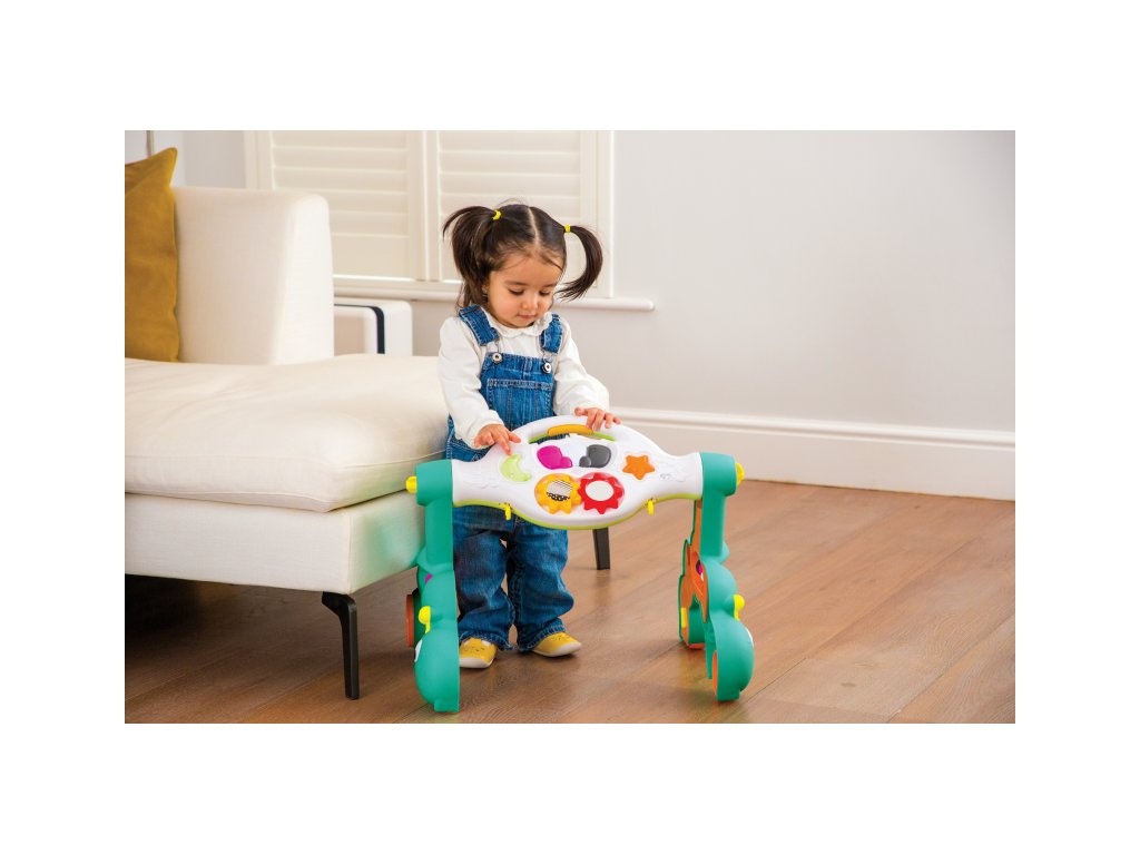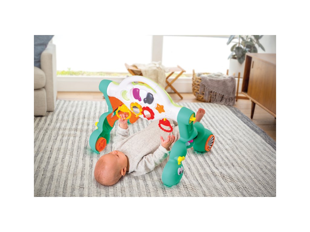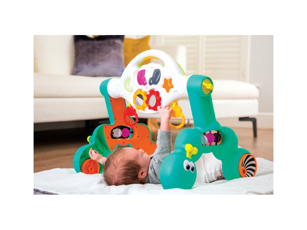 Variabilní hračku lze používat jako hrazdu na hrací deku, hrací pult pro hru vsedě i jako chodítko pro stabilitu při prvních krůčcích. Pro zabavení a zároveň podporu rozvoje smyslů dítěte nabízí různorodé aktivity a pohyblivé části ke zkoumání.