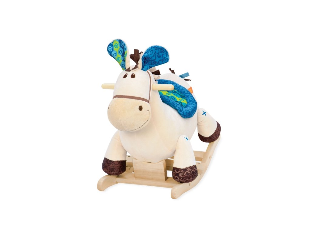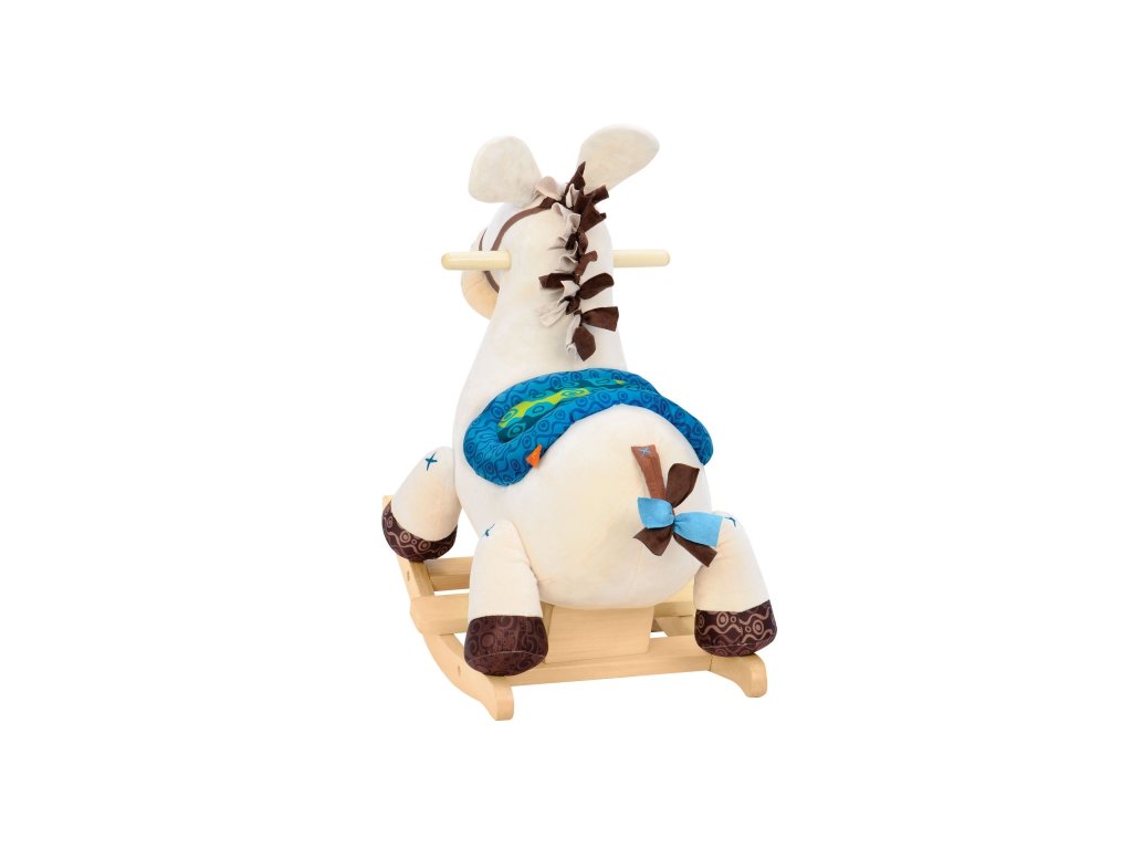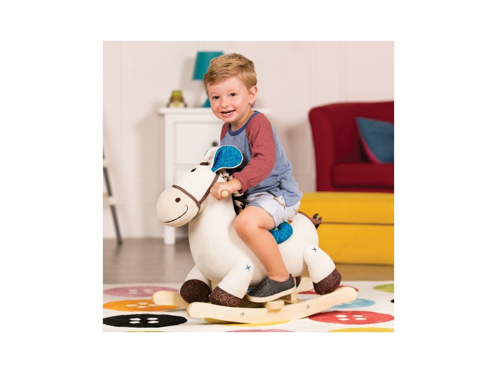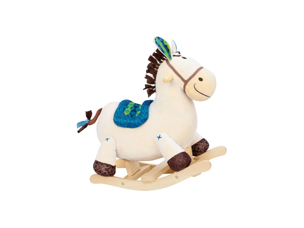 Roztomilý plyšový houpací kůň s dřevěnou základnou a držadly. Během houpání se ozývá klapot koňských kopýtek.