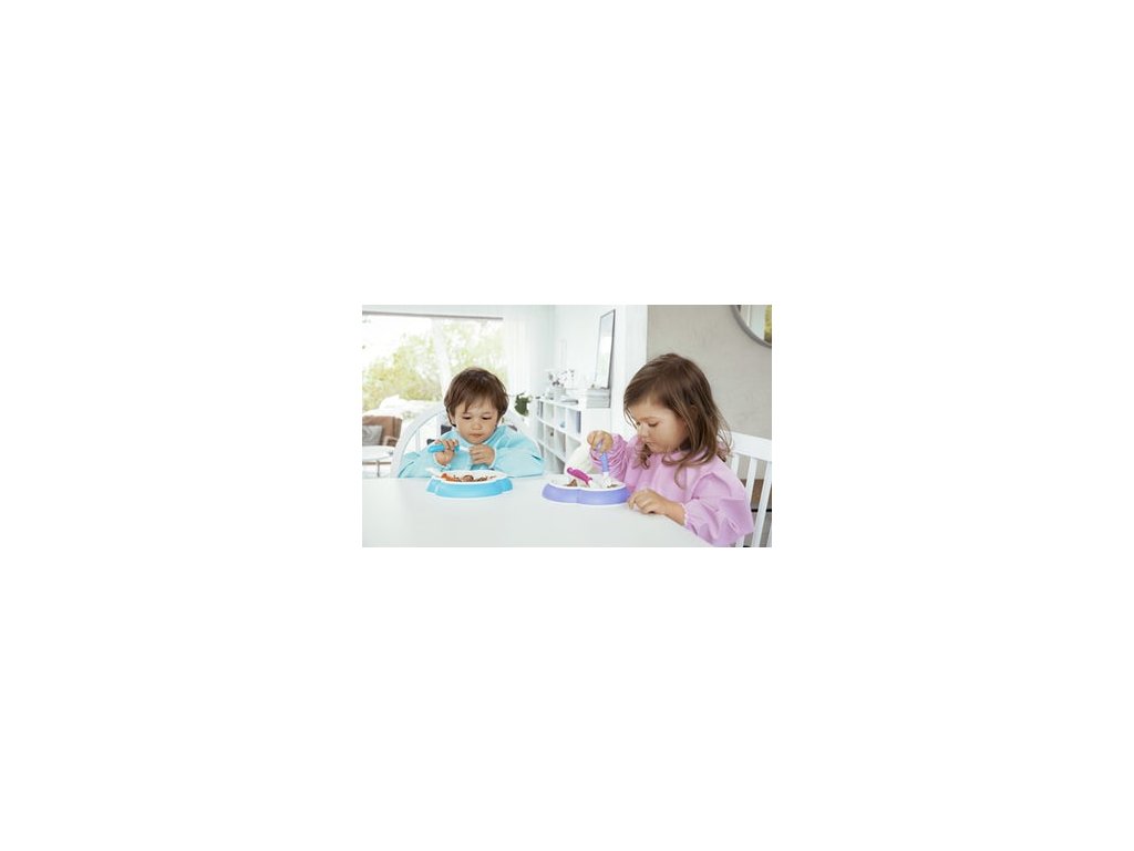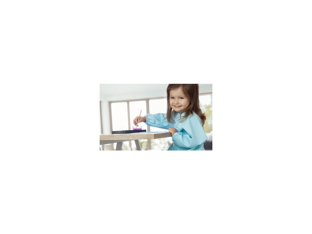 Zástěrka má dlouhé rukávy s pohodlnými elastickými pásy na zápěstí. Její příjemné rozměry chrání oblečení zepředu i zezadu. Zapíná se vzadu za krkem – lze zvolit ze dvou velikostí tak, aby zástěrka dítěti dokonale sedla.