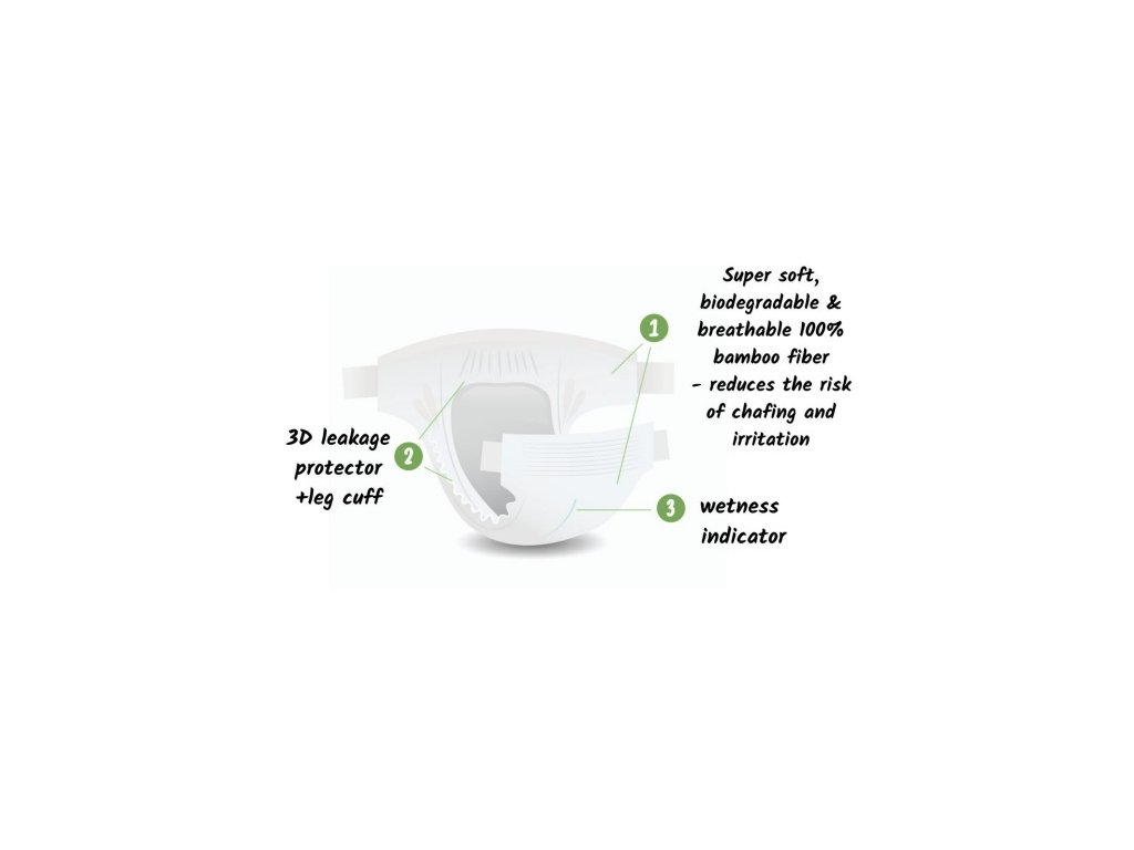 Měkké, prodyšné, super absorbční jednorázové pleny s vrchní a spodní vrstvou ze 100% bambusového vlákna chrání citlivou pokožku dítěte před opruzením a podrážděním.