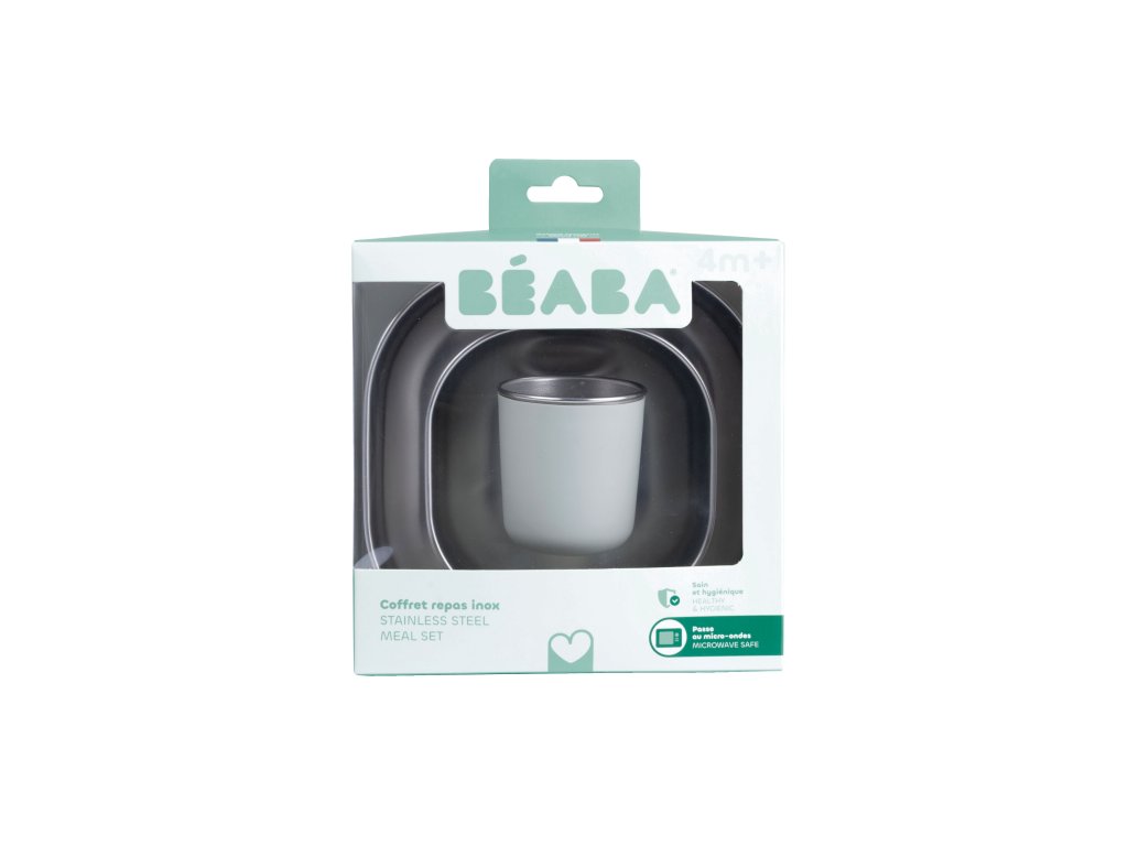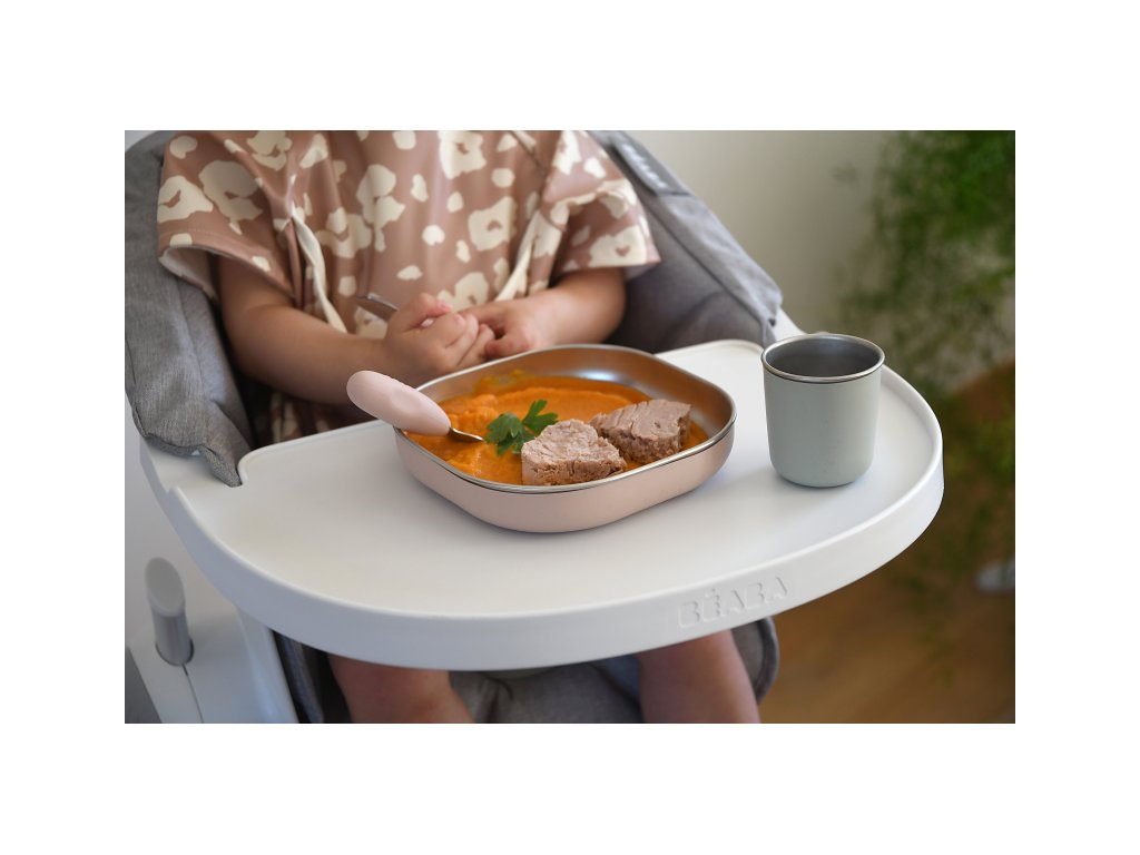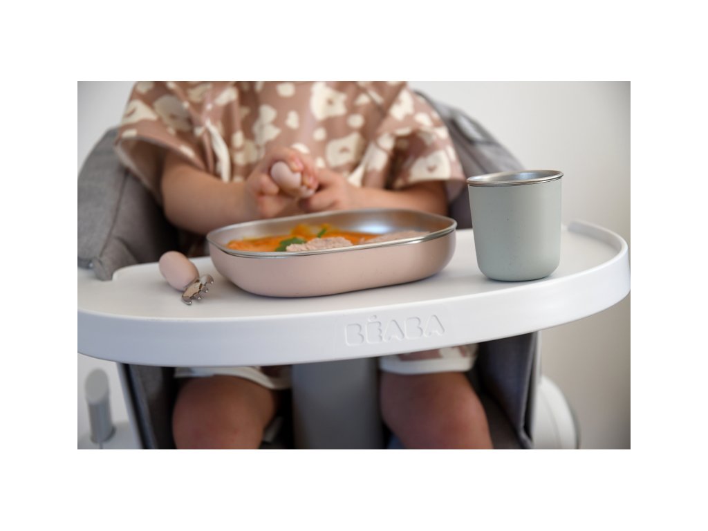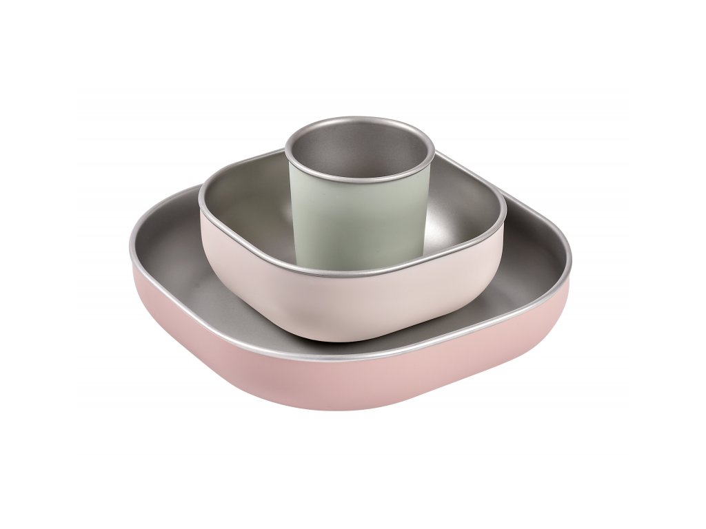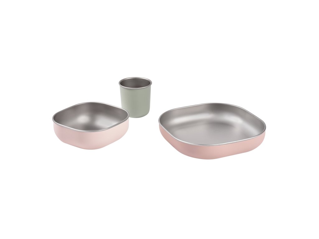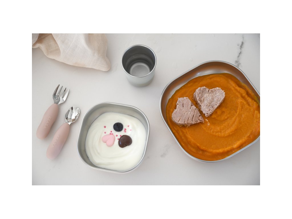 Jídelní sadu inovativního nerezového nádobí se silikonovou povrchovou vrstvou tvoří talíř, miska a kelímek. Ergonomický tvar s vysokými stranami a zaoblenými rohy jsou ideální pro učení dětí samostatnému stolování.