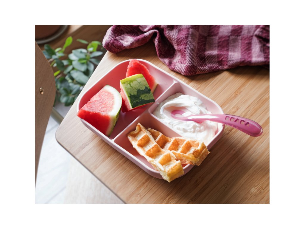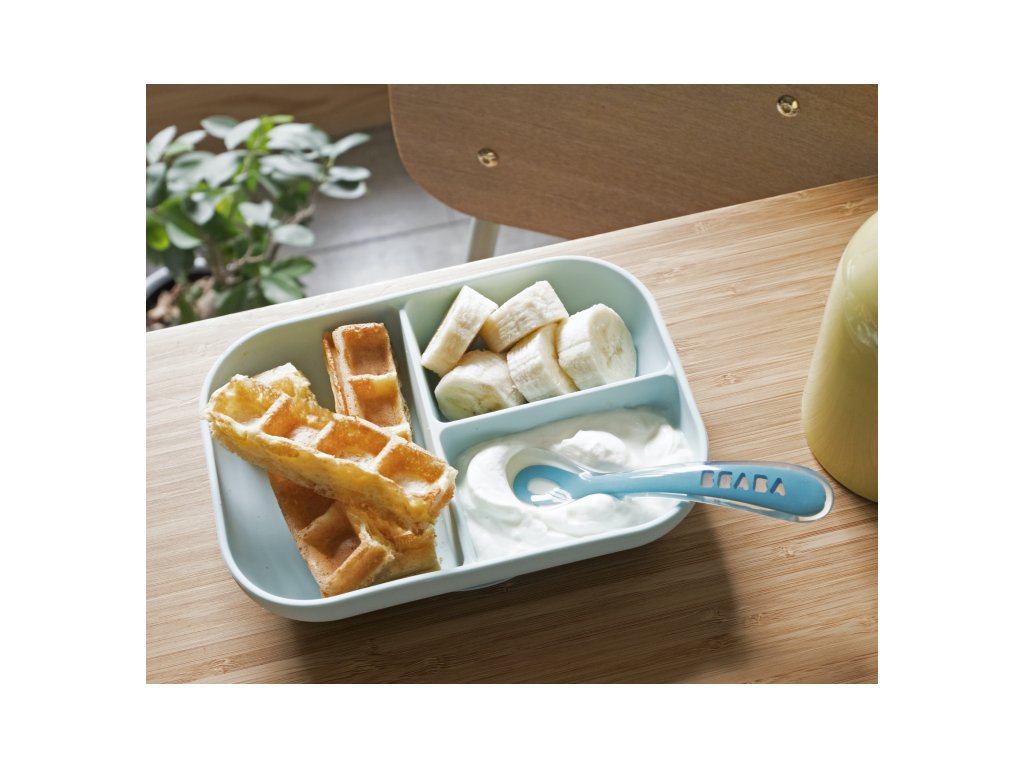 Talíř s přísavkou z vysoce kvalitního silikonu umožňuje uchycení ke stolu nebo pultu jídelní židličky. Ergonomický tvar usnadňuje nabírání příkrmu. Tři přihrádky umožňují oddělené servírování jednotlivých součástí dětského pokrmu.