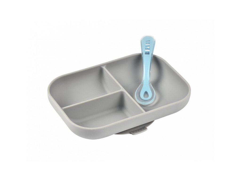 Talíř silikonový dělený s přísavkou + lžička Grey