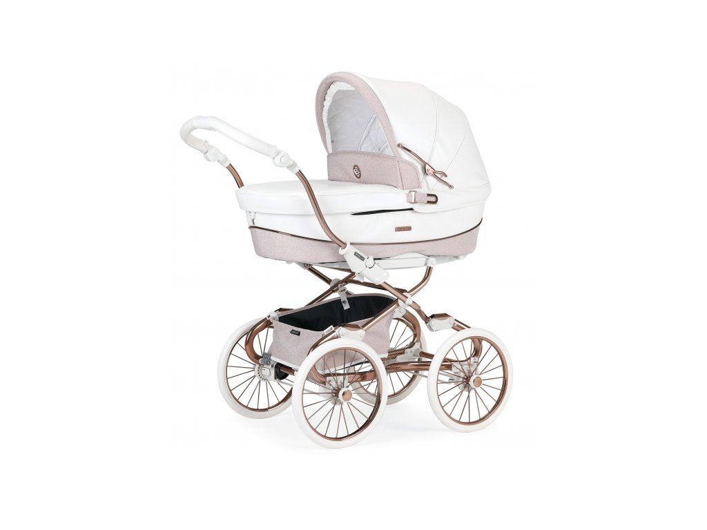 Elegantní, měkce odpružený podvozek s důrazem kladeným na funkčnost a bezpečnost. Klasický vzhled je spojen s výhodou natáčení předních kol (40°) s možností aretace. Systém čtyřbodového zavěšení pružení zajišťuje velmi příjemnou jízdu. Konstrukce vyráběna v úpravě chrom,.Vyplétaná kola o průměru 36 cm jsou opatřena kuličkovými ložisky, běhoun kola z materiálu EVA. Rukojeť je výškově nastavitelná. V případě potřeby je možné dokoupit do terénu kola APS o průměru 29 cm, bezdušová, pryžová.