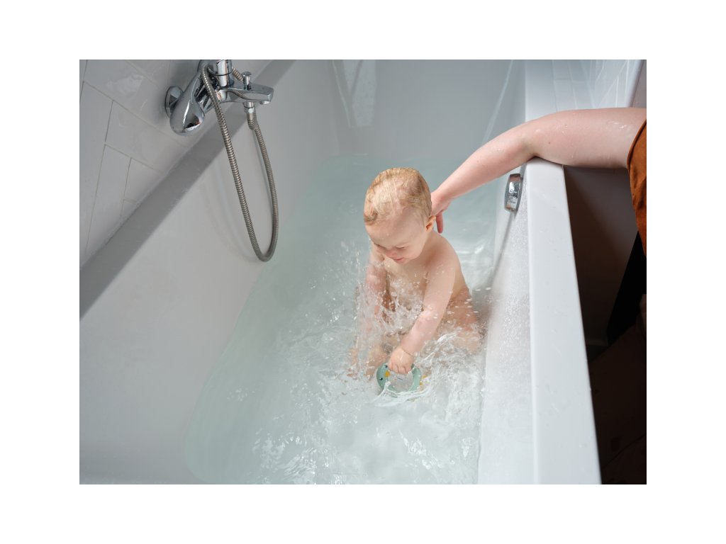 Teploměr pro kontrolu teploty vody v dětské koupeli plave na hladině pro snadné čtení změřené teploty.