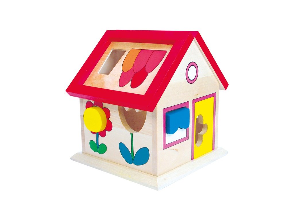 Dřevěný domeček Bino, určený pro vkládání základních tvarů ve veselých barvách. Rozměry: 20×18×21 cm