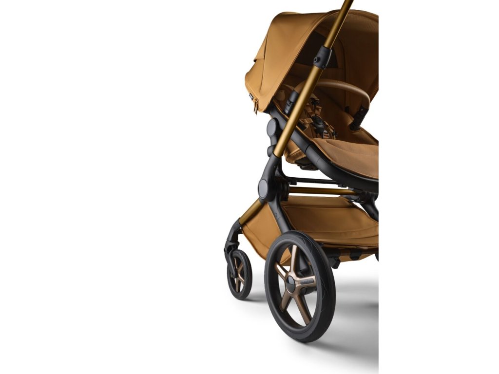 Na první pohled může vypadat docela obyčejně, ale Bugaboo Fox⁵ je napěchovaný technologickými vychytávkami. Centrální kloub s tlumičem nárazů pracuje ruku v ruce s odpruženými koly pro co nejhladší jízdu za jakékoliv situace. Zcela nové prodyšné lůžko v sobě ukrývá prodyšnou matraci ze speciální 3D síťoviny, která zaručuje dostatečný přísun vzduchu a udržuje správné spánkové klima. Opravdoví velikáni ocení možnost prodloužit opěrku nohou, stejně jako sluneční stříšku. Díky tomu vznikne ještě více prostoru pro vysoké děti.