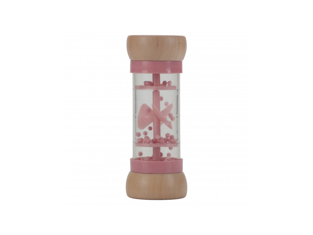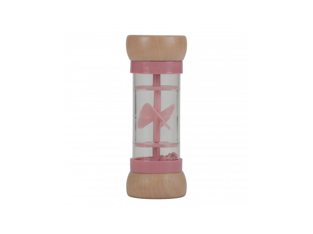 Chrastítko v krásném provedení v kombinaci dřeva a plastu. Korálky i otočná vrtule uvnitř chrastítka při pohybu jemně chrastí. Tvar hračky umožňuje snadné uchopení dětskými ručičkami.