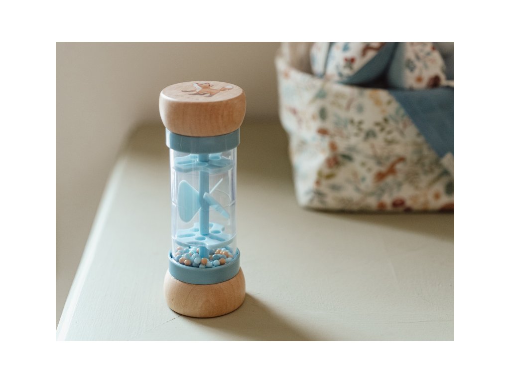 Chrastítko v krásném provedení v kombinaci dřeva a plastu. Korálky i otočná vrtule uvnitř chrastítka při pohybu jemně chrastí. Tvar hračky umožňuje snadné uchopení dětskými ručičkami.