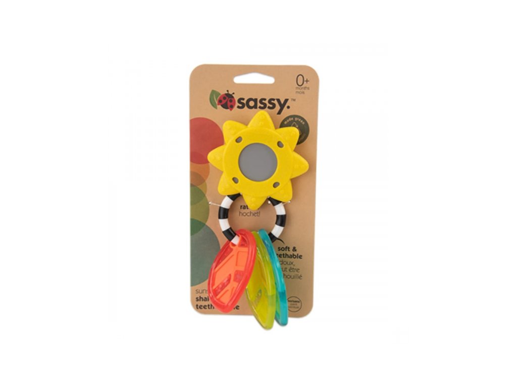 Chrastítko ve výrazných, kontrastních barvách upoutá zrak dítěte, různorodé textury a pohyblivé lístky lákají dítě ke zkoumání rukama i ústy.