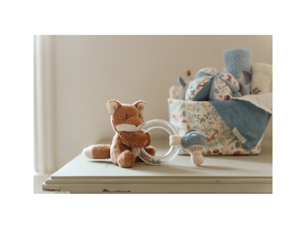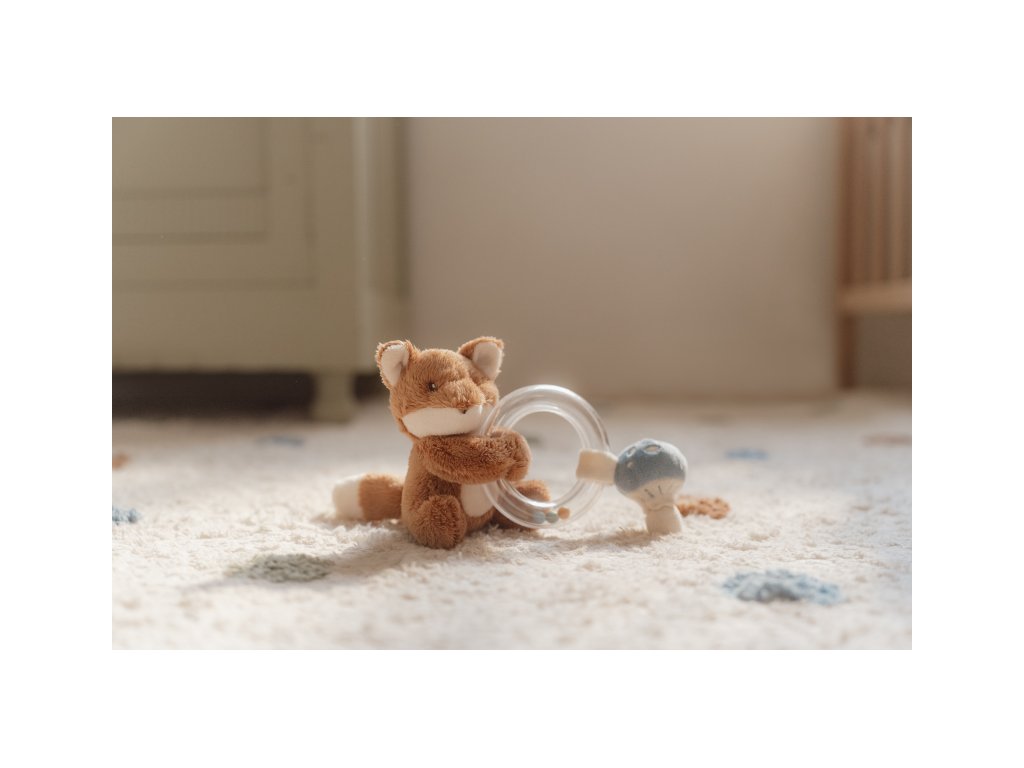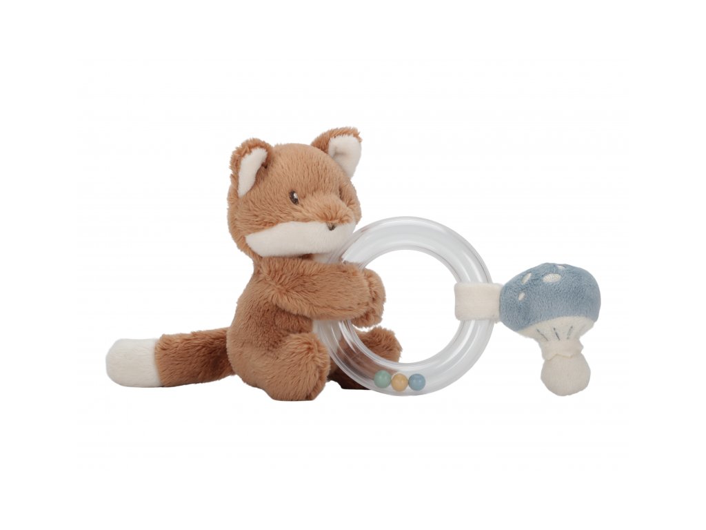 Originální chrastítko v podobě průhledného kroužku s chrasticími korálky a plyšovou liškou a houbičkou je ideální jako první hračka pro vaše miminko.