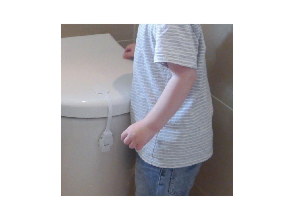 Záchodový zámek Clippasafe je snadno použitelný a drží záchodový poklop bezpečně zamčený, dokud jej neuvolní dospělý.
