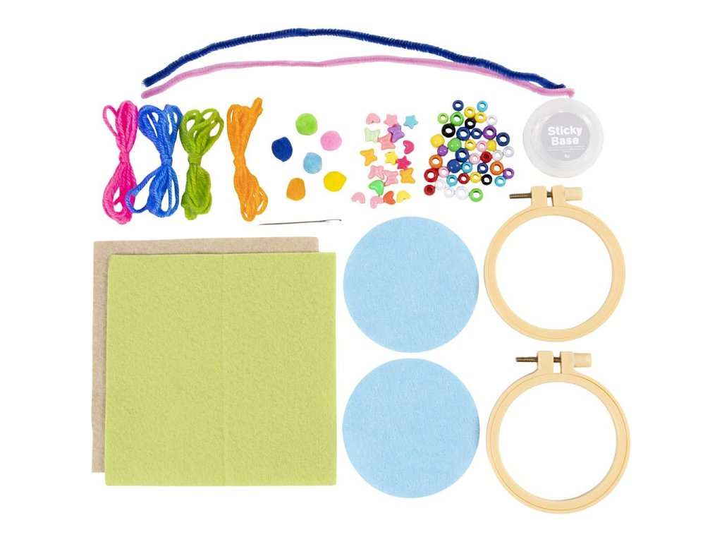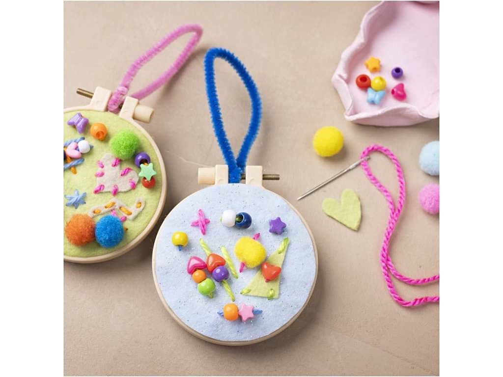 Objevte radost z tvoření s touto krásnou sadou, která dětem umožní vytvořit barevné závěsné dekorace z pomponků, plstě, korálků a výšivky. Ideální pro první seznámení s vyšíváním i jako zábavný projekt pro rozvoj fantazie a jemné motoriky.
