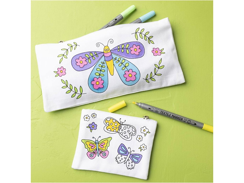 • V balení najdete penál i peněženku s potištěným motivem – stačí vzít přiložené fixy na textil a pustit se do vybarvování