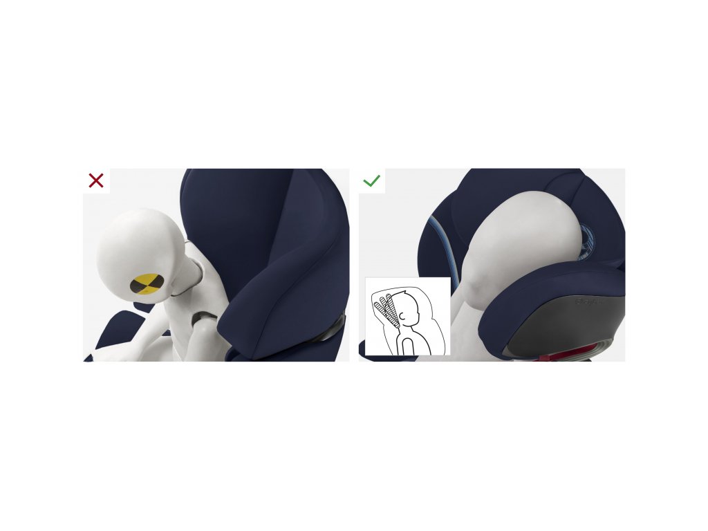 - Patentovaná naklápěcí opěrka hlavy: Zabraňuje přepadnutí hlavy spícího dítěte dopředu a zajišťuje tak, aby byla neustále v bezpečné zóně autosedačky, což je důležité především při bočním nárazu.