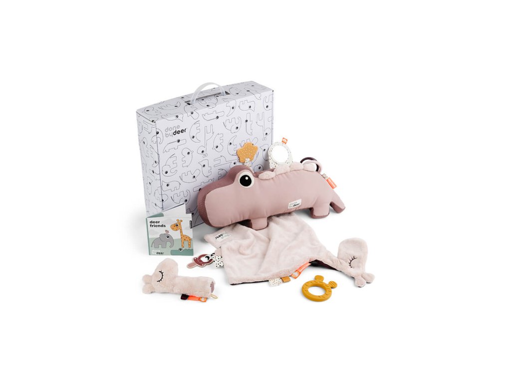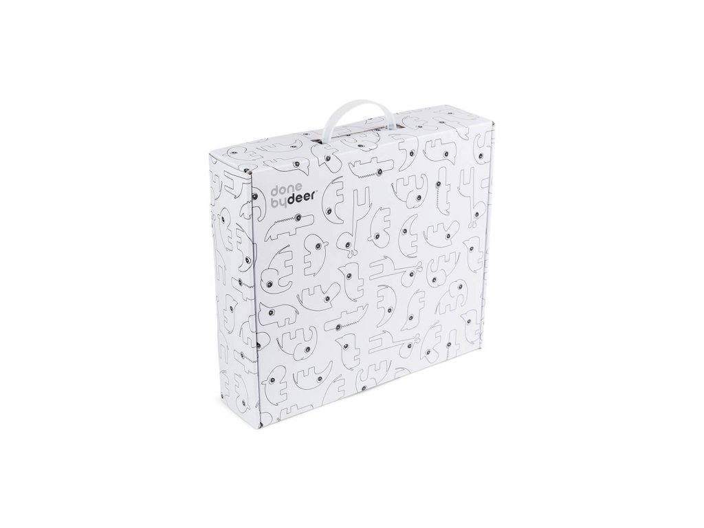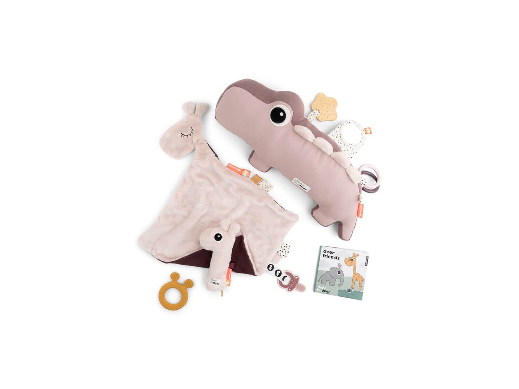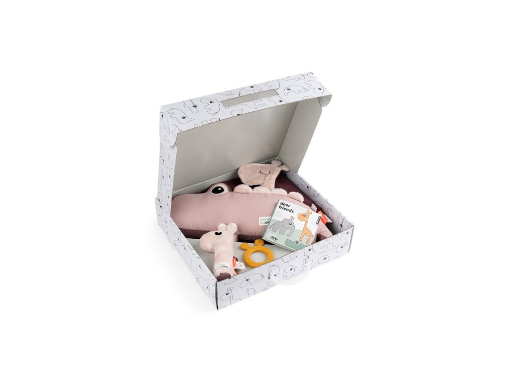 S dárkovým boxem Play time získáte čtyři nezbytné hračky Done by Deer spojené v jedné roztomilé dárkové krabici. Součástí boxu je Aktivní hračka Croco, přítulka Raffi, silikonové kousátko a chrastítko Raffi. Tato dárková krabice hračkami pro miminka je skvělou startovací sadou a perfektním nápadem na dárek pro nového malého člena rodiny. Zábavný box obsahuje knížečku Deer friends. Roztomilé hračky jsou v jemných odstínech. Pevná bílá kartonová krabice je zdobena naším klasickým černým obrysovým potiskem a je ideální pro uložení v dětském pokoji.