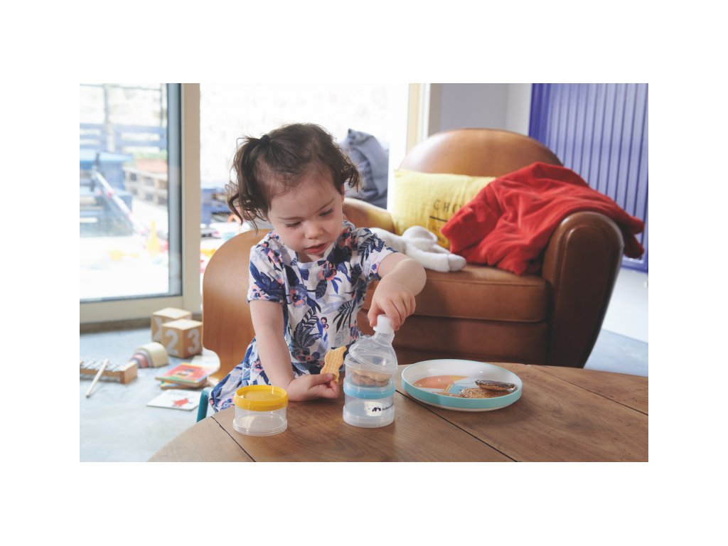 Tři šroubovací kelímky umožňují oddělené uchování jednotlivých částí svačinky, např. kousků ovoce nebo zeleniny, dětských sušenek apod.