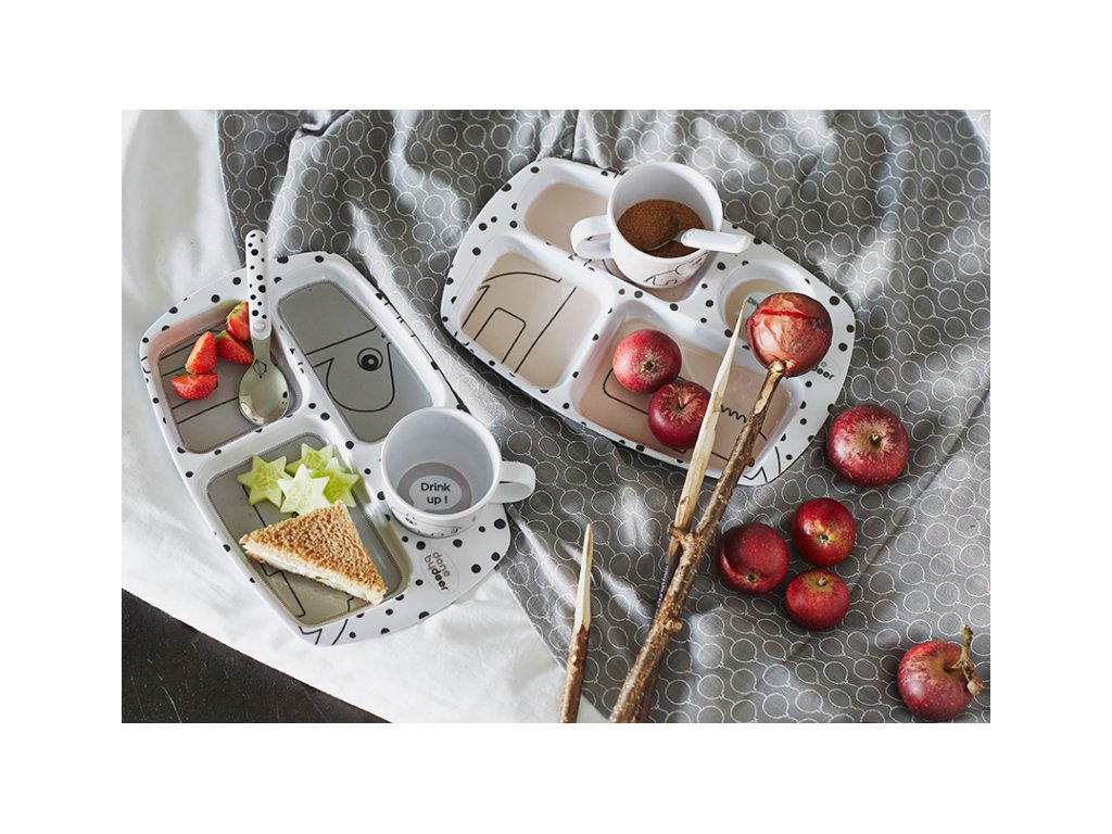 Čtyři přihrádky na zeleninu, maso nebo přílohy. Zábavný design se zvířátky a drobnými tečkami kolem talíře nadchne každé malé dítě.