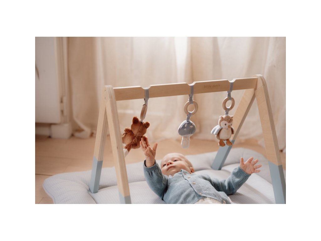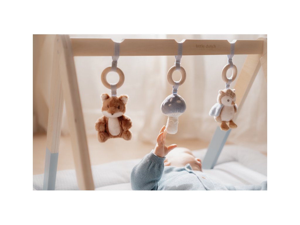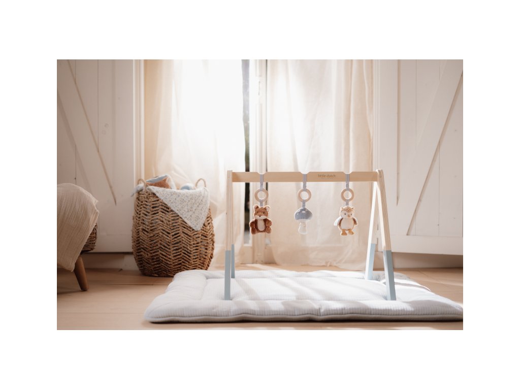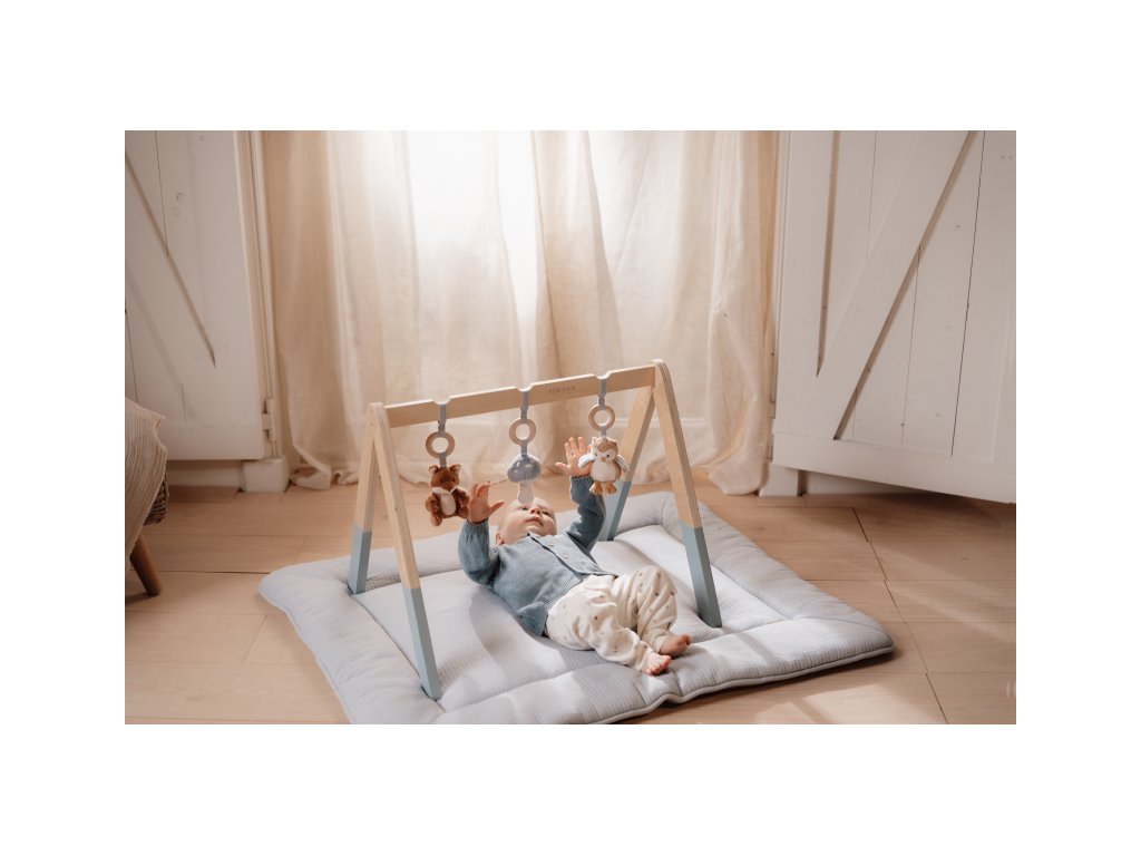 Stylová dřevěná hrazdička se třemi zavěšenými plyšovými hračkami v podobě lišky, sovy a houbičky poskytne vašemu miminku spoustu zábavy při hraní na dece. Jednotlivé hračky lákají dítě ke zkoumání a dotýkání, při pohybu chrastí a šustí. Odnímatelné hračky je možné používat i samostatně.