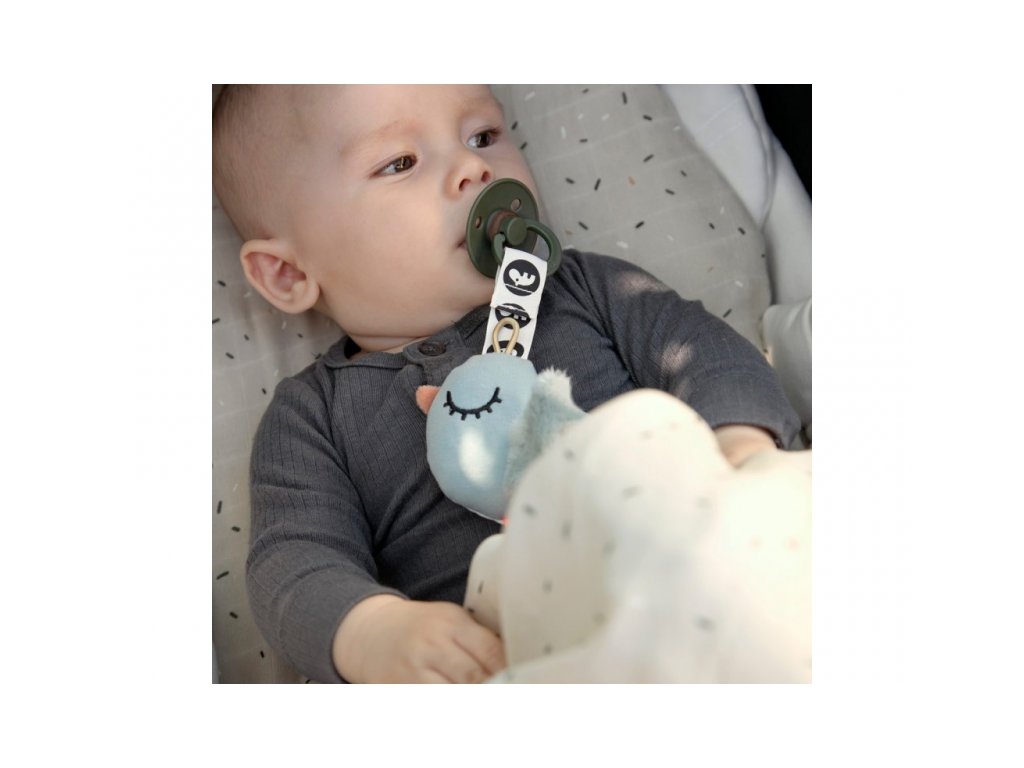 Držátko má praktickou sponu na suchý zip a elastické poutko k uchycení dudlíků s držadly i bez nich.