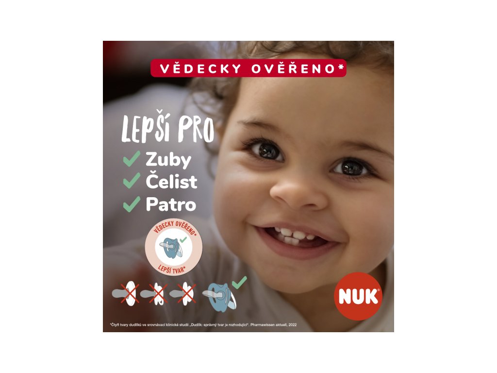 - Lepší tvar pro správný vývoj zoubků, čelisti i patra ve srovnání s běžnými tvary dudlíků na trhu: vědecky prokázáno: Výrobky NUK mají jen minimální vliv na zoubky, čelist i patro**