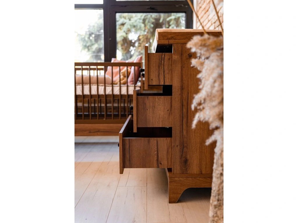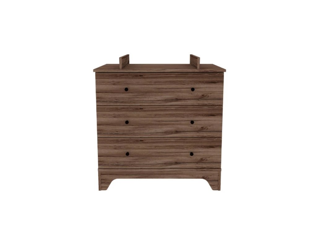 Moderní, tří zásuvková komoda do dětského pokoje, ideální pro uložení přebalovacích potřeb. V odstínu tmavého ořechu s černým žilkováním, které dodává nábytku přírodní vzhled a charakter. Doplněním přebalovacího nástavce, vhodná pro přebalování.