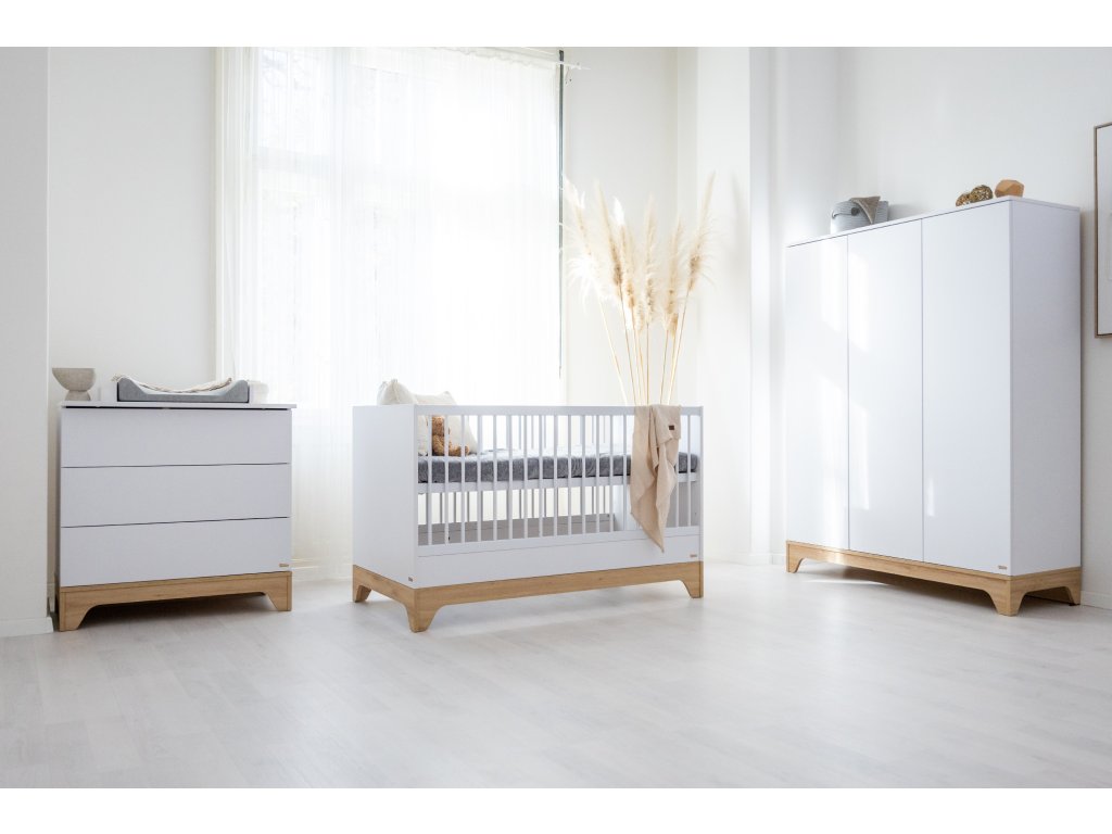 Variabilní dětská postýlka Lumina White 140x70cm bude sloužit vám i vašemu dítěti po dlouhou dobu až do 5-6let. Její čistý design, přírodní vzor dřeva a kombinace bílé barvy vyzařují teplo a klid a dokonale zapadnou do každého interiéru.