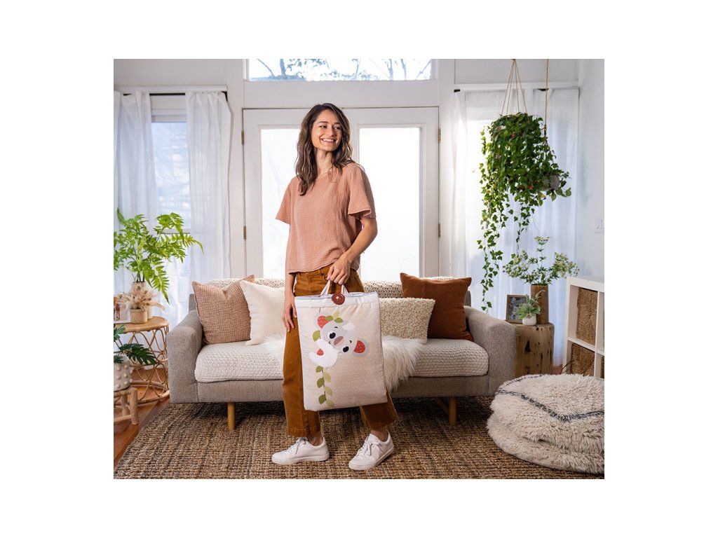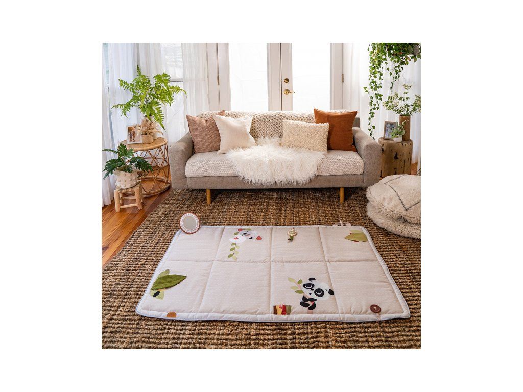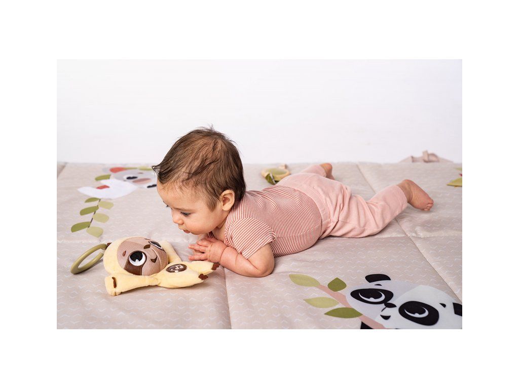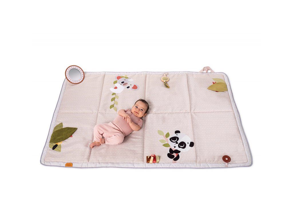 Extra velká, měkká hrací deka s krásnými ilustracemi koaly a pandy nabízí množství aktivit k zabavení dítěte a rozvíjení jeho smyslů a motorických dovedností: bezpečné zrcátko, oddělitelné dřevěné chrastítko, barevné stužky i šusticí části.