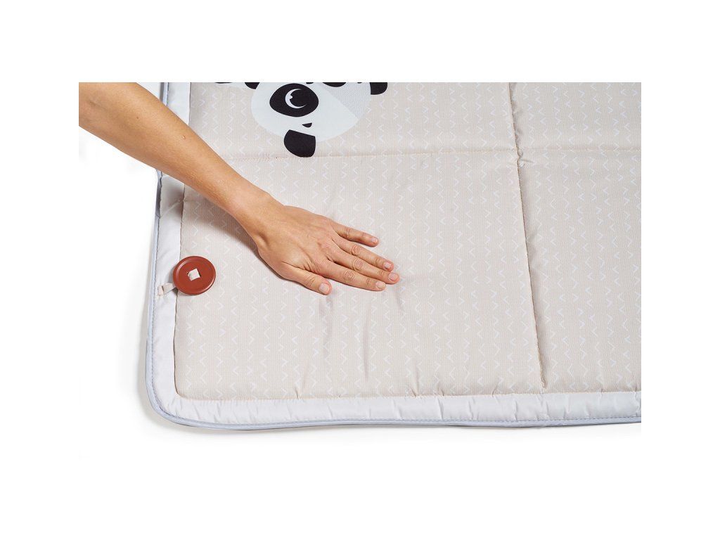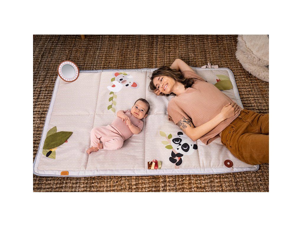 Extra velká, měkká hrací deka s krásnými ilustracemi koaly a pandy nabízí množství aktivit k zabavení dítěte a rozvíjení jeho smyslů a motorických dovedností: bezpečné zrcátko, oddělitelné dřevěné chrastítko...