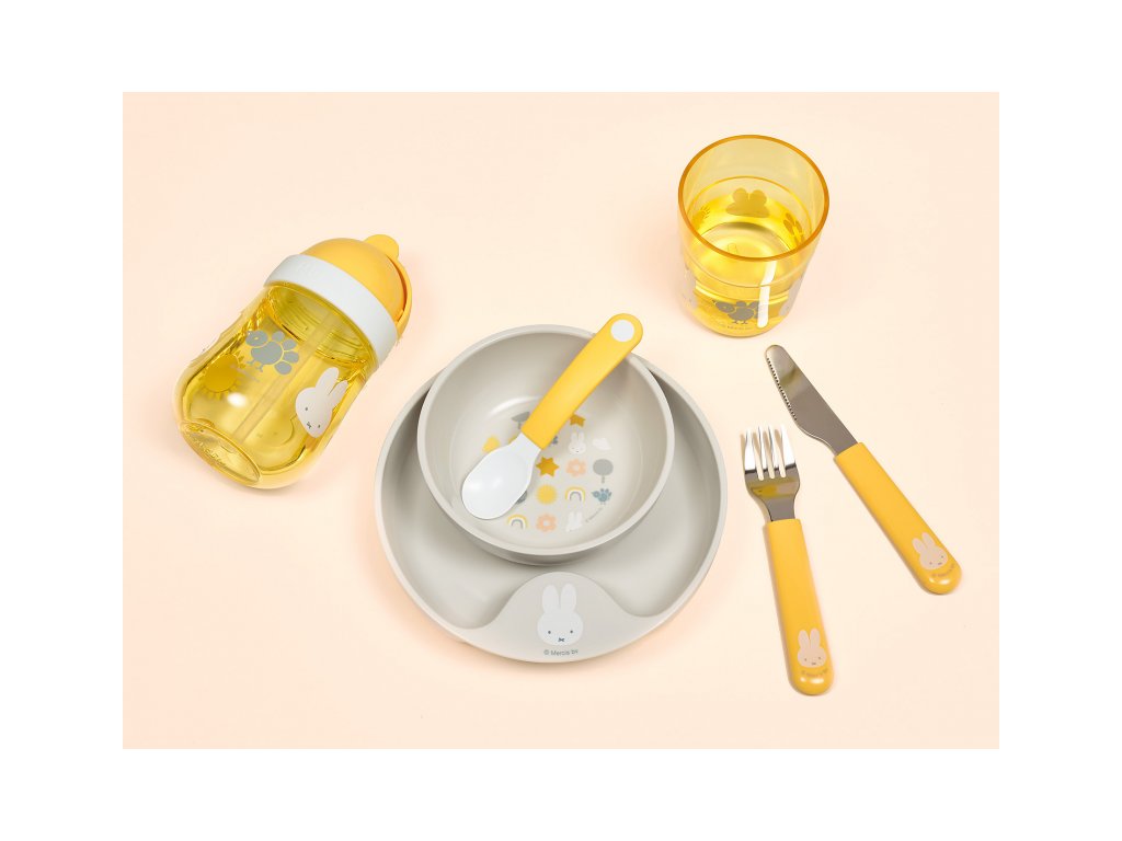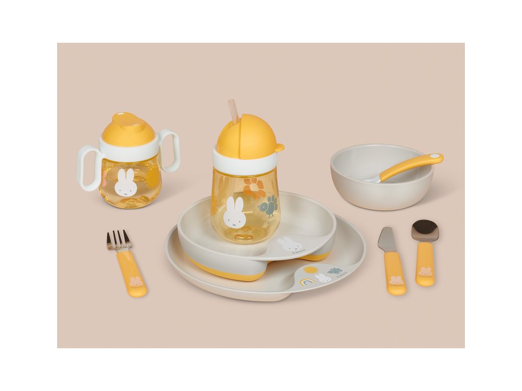 Hrnek v krásném designu kolekce Miffy má zaklapávací měkké brčko, které brání vytečení obsahu hrnku při přenášení.