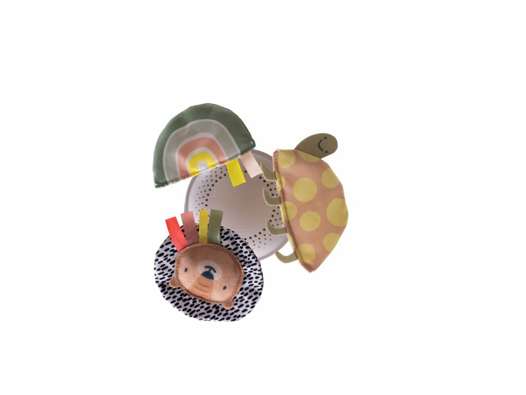 Pozornost dítěte upoutají roztomilé otáčející se plyšové hračky v jemných, pastelových barvách.