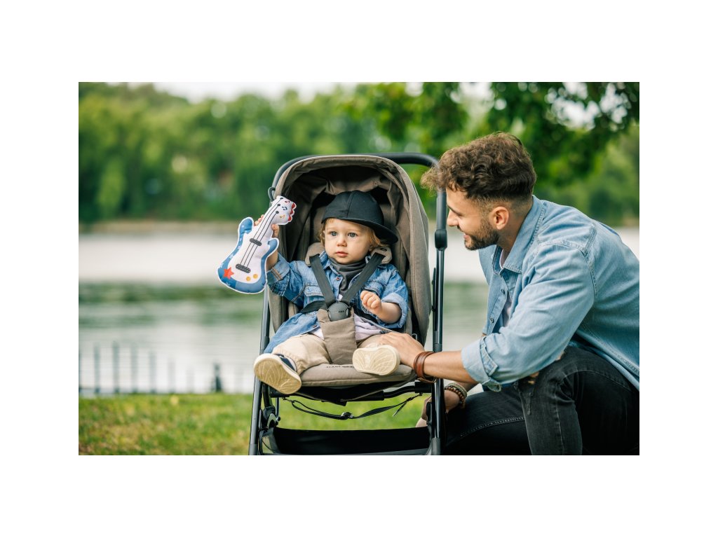 První kytara pro vašeho malého rockera či rockerku je vyrobena z měkkého textilního materiálu a po zmáčknutí přehrává 7 různých rockových melodií a zvuků. Díky plastovému kroužku je možné ji zavěsit na autosedačku či