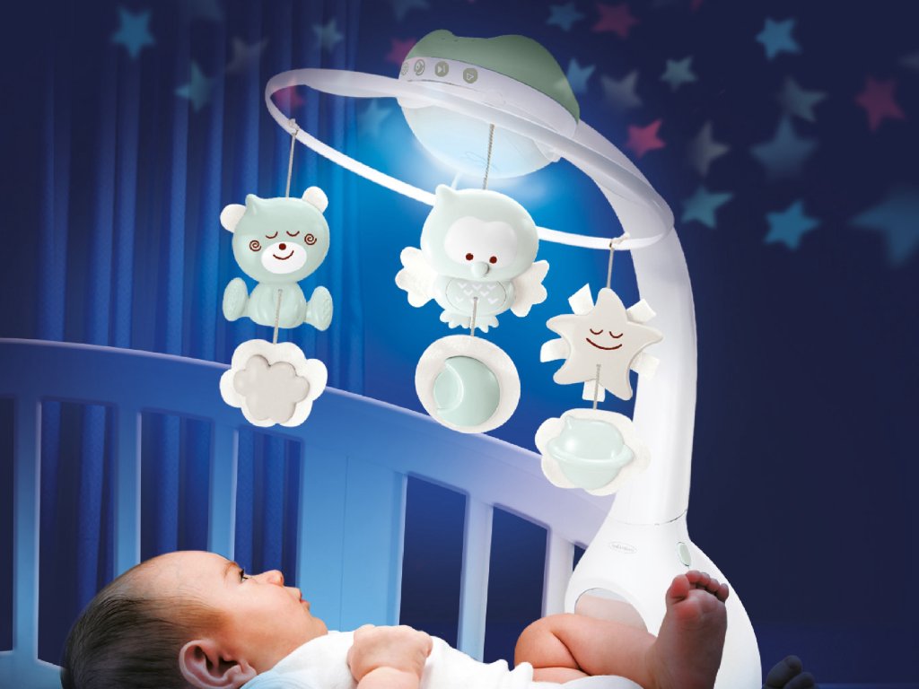 Hudební kolotoč se světelným projektorem pro snadné usínání i zabavení dítěte. Světelný projektor promítá na stěnu či strop hvězdičky a jemně tak osvítí dětský pokoj.