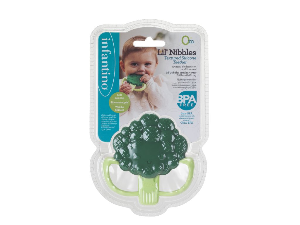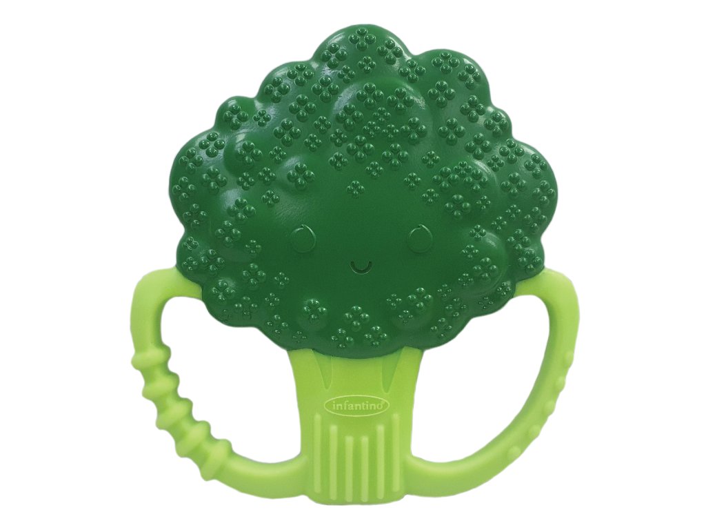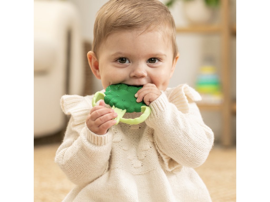 Rozkošné kousátko v podobě usměvavé brokolice je vyrobeno z pružného měkkého silikonu. Různorodé textury lákají dítě ke zkoumání v ústech, masírováním dásní kousátko pomáhá dítěti při prořezávání prvních zoubků.