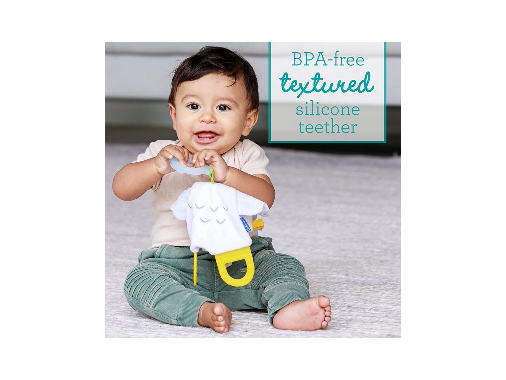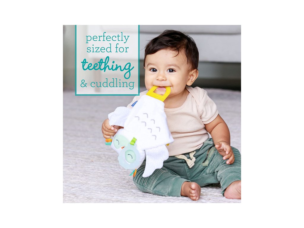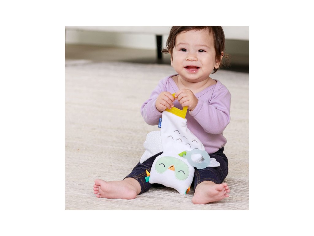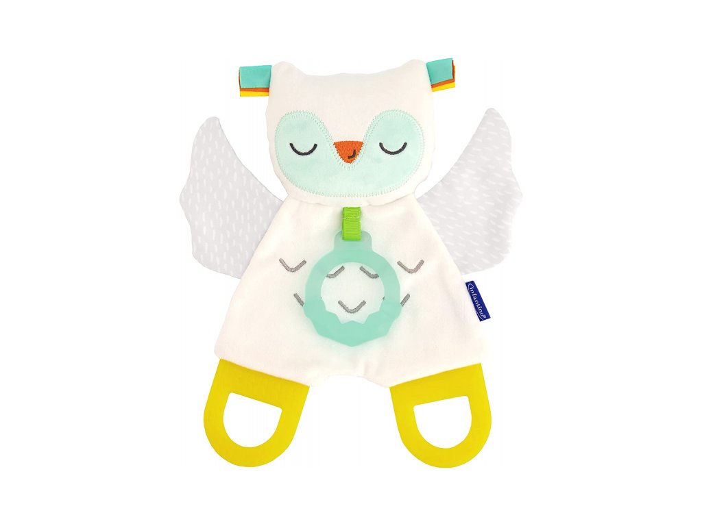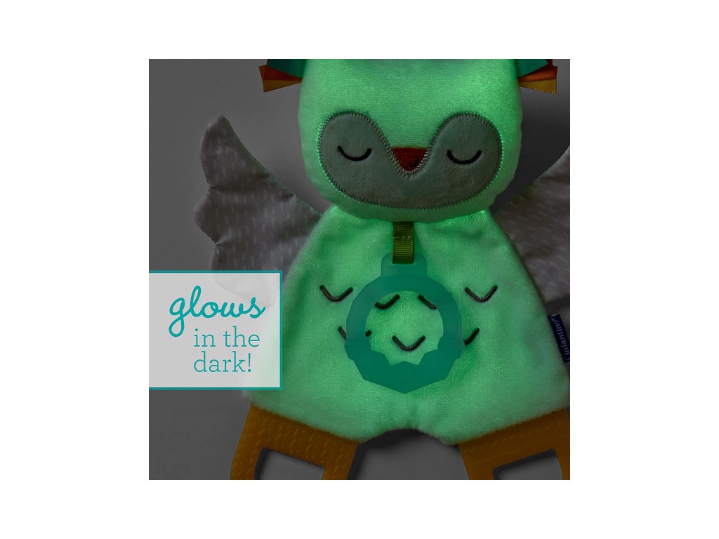 Unikátní muchláček v podobě sovy je vyrobený z materiálu, který ve tmě jemně svítí. Je tak ideální jako hračka do postýlky pro uklidnění vašeho dítěte v noci. Součástí hračky jsou i tři kousátka z jemného silikonu, která pomáhají dítěti při prořezávání prvních zoubků. Šusticí křídla a různorodé textury hračky budou lákat dítě ke zkoumání.