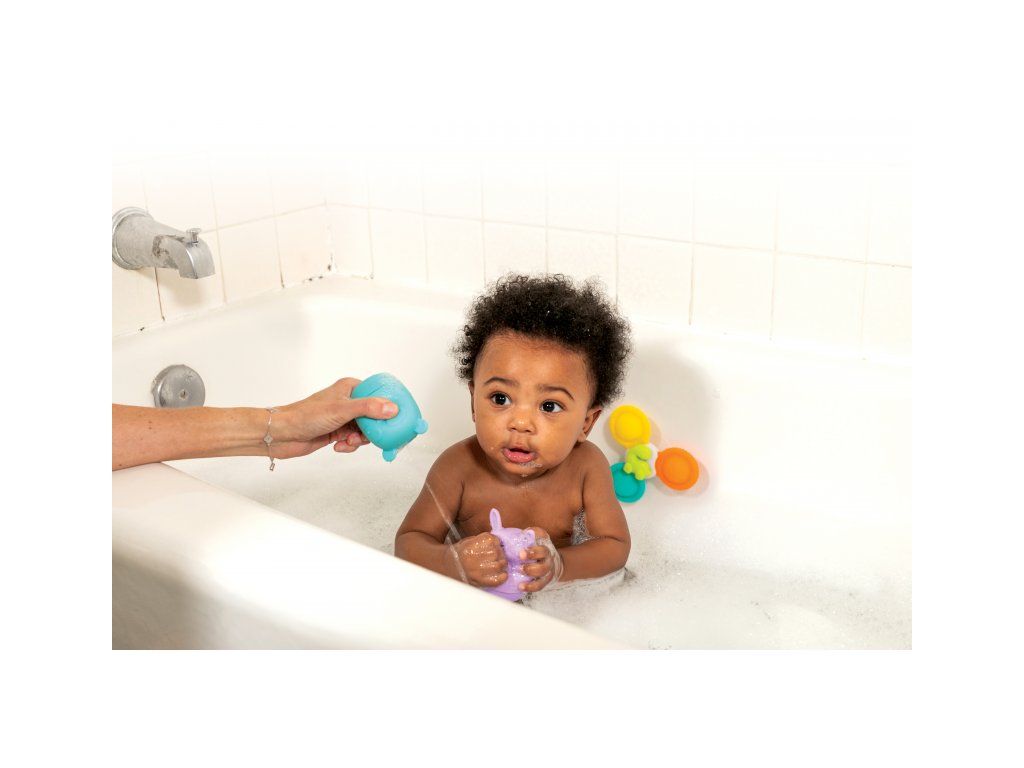 Sada obsahuje 4 kelímky s otvory, dvě stříkací zvířátka s možností rozšroubování pro snadné čištění, čtyři lodičky a jeden spinner s přísavkou na vanu.