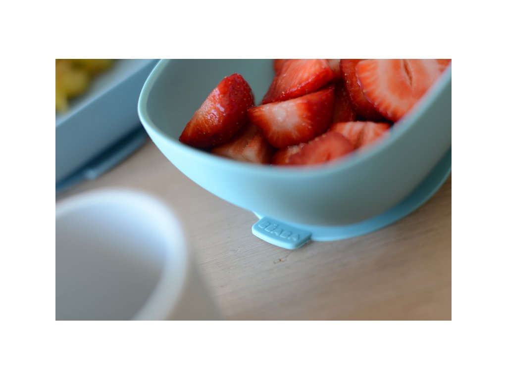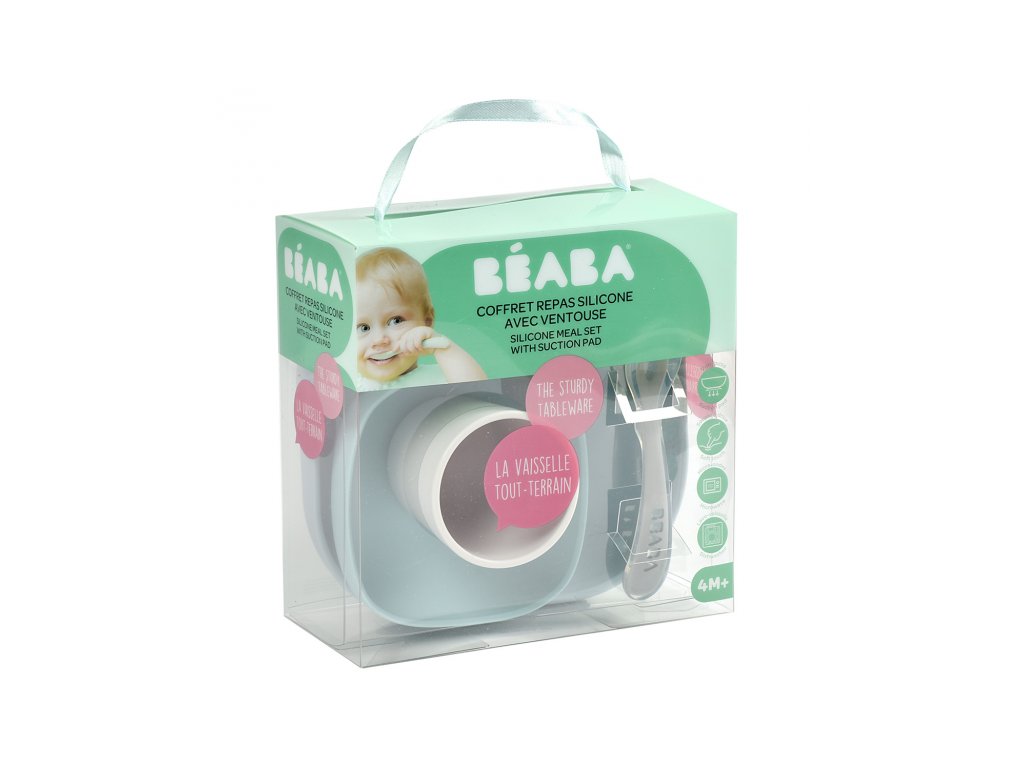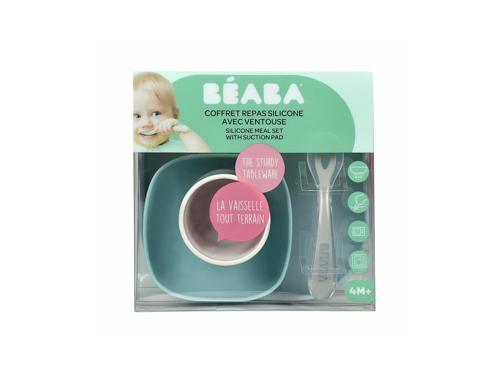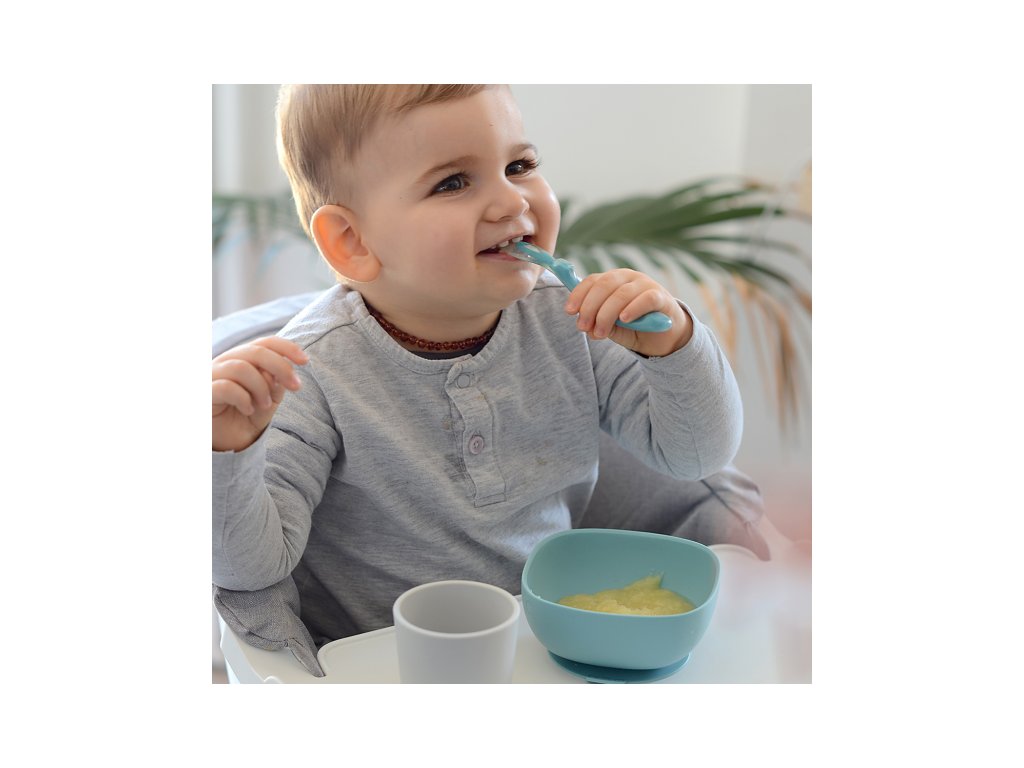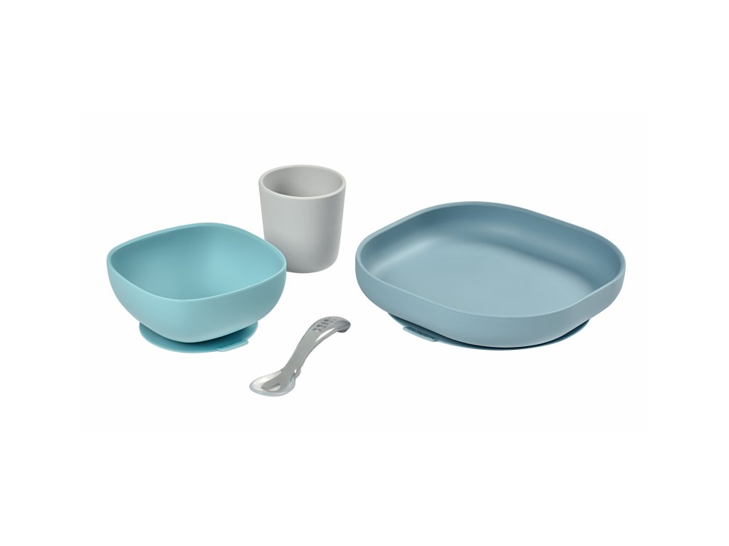 Sada talíře, misky, kelímku na pití a lžičky z vysoce kvalitního silikonu je ideální pro první samostatné krmení. Přísavka u misky a talíře umožňuje uchycení ke stolu nebo pultu jídelní židličky. Ergonomický tvar usnadňuje nabírání příkrmu.