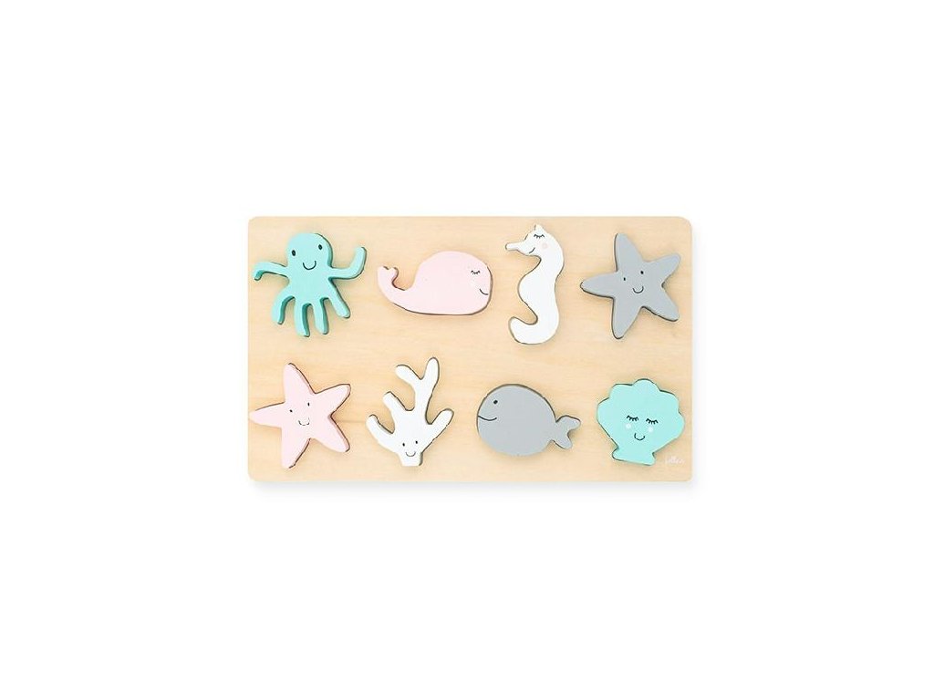 Dřevěné puzzle pro nejmenší výborně podporují koordinaci očí a rukou. Hra se skládá z desky kde jsou otvory pro mořská zvířátka, která se musí správně umístit. Balení obsahuje desku a 8 různých mořských zvířátek ve 4 barvách.