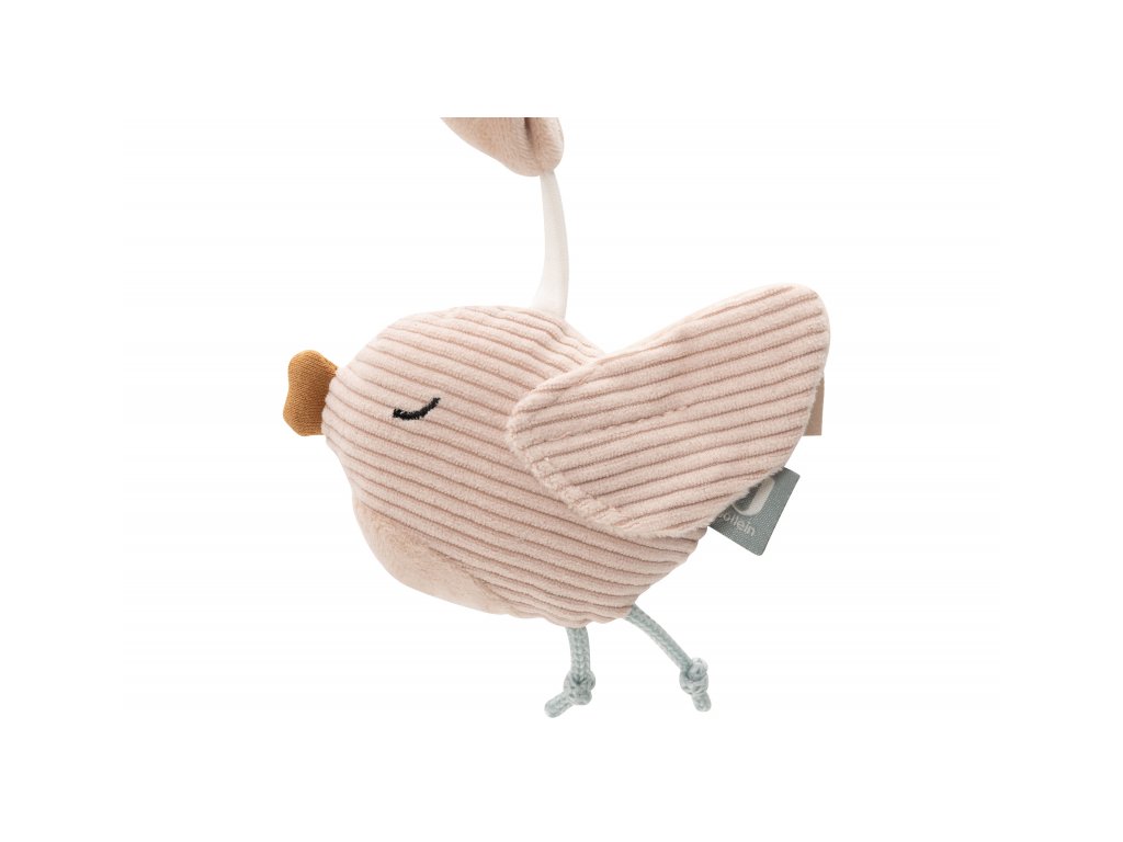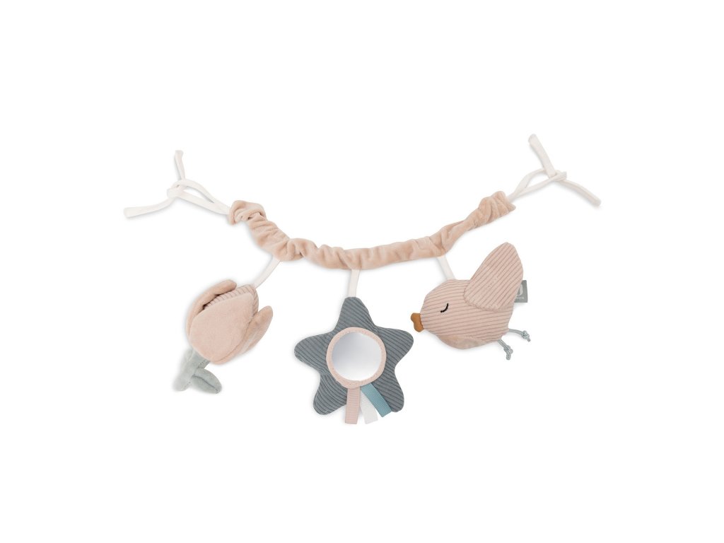 Řetěz na kočárek či autosedačku se zavěšenými hračkami v podobě ptáčka, tulipánu a hvězdičky s bezepčným zrcátkem zabaví vaše miminko v kočárku či autosedačce. Měkké hračky vyrobené z jemného plyše chrastí, šustí a nabízí různé textury pro zkoumání. Hračky stimulují koordinaci ruka / oko dítěte.