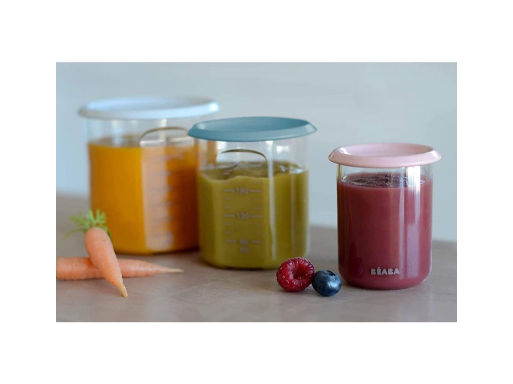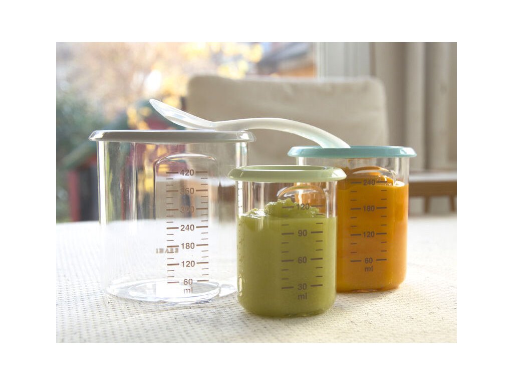 Kelímek Beaba na dětskou stravu ze speciálního polykarbonátového plastu s hermeticky uzavíratelným víčkem.
