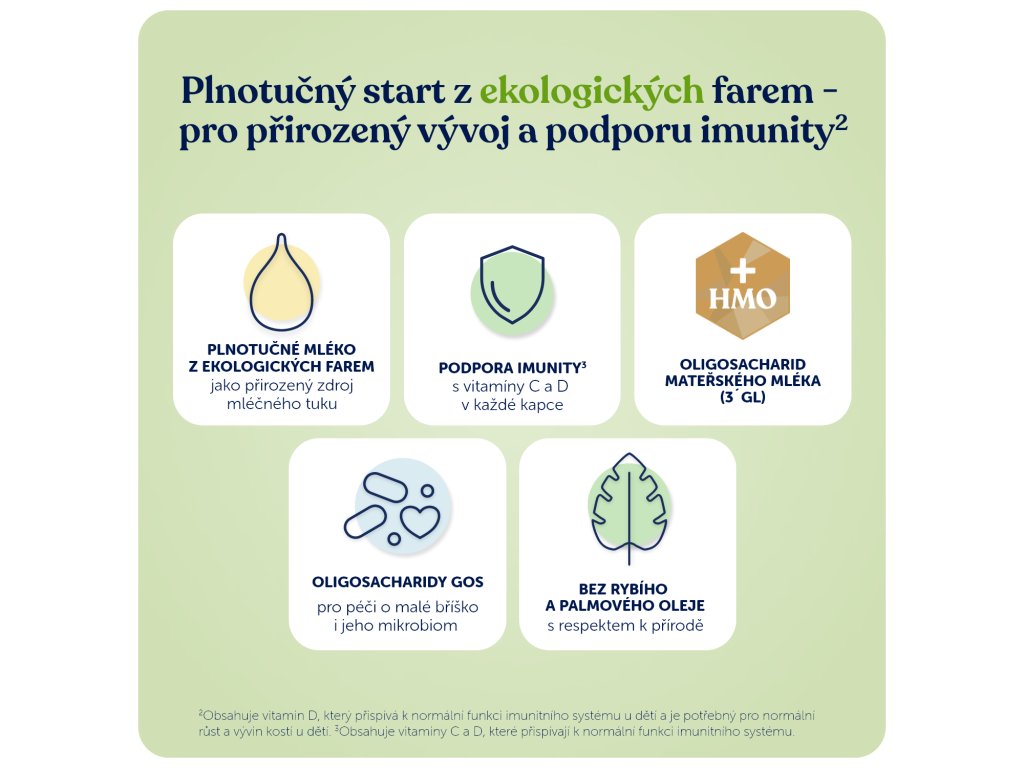 BIO plnotučné MLÉKO (141 g tekutého MLÉKA na 100 g prášku), BIO odstředěné MLÉKO, BIO laktóza (z MLÉKA), BIO syrovátková bílkovina (z MLÉKA), BIO rostlinné oleje (slunečnicový, kokosový, řepkový), BIO galaktooligosacharidy (z MLÉKA), emulgátor: BIO slunečnicový lecitin, citronan sodný, olej z mikrořas Schizochytrium sp., citrát vápenatý, fosforečnan draselný, fosforečnan vápenatý, chlorid draselný, uhličitan vápenatý, vitamin C, chlorid hořečnatý, taurin, pyrofosfát železitý, vitamin E, síran zinečnatý, vitamin D3, niacin, kyselina pantothenová, vitamin A, seleničitan sodný, biotin, vitamin K, thiamin, síran měďnatý, jodid draselný, hydroxid vápenatý, kyselina listová, vitamin B12, vitamin B6, síran manganatý, regulátor kyselosti: kyselina citronová.