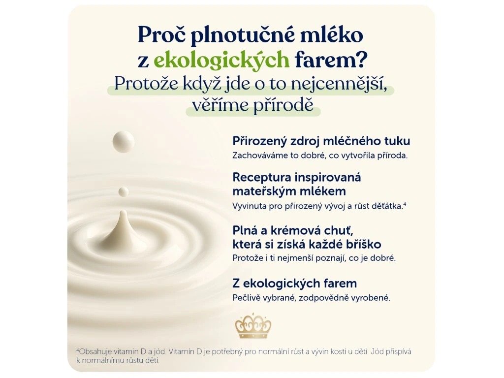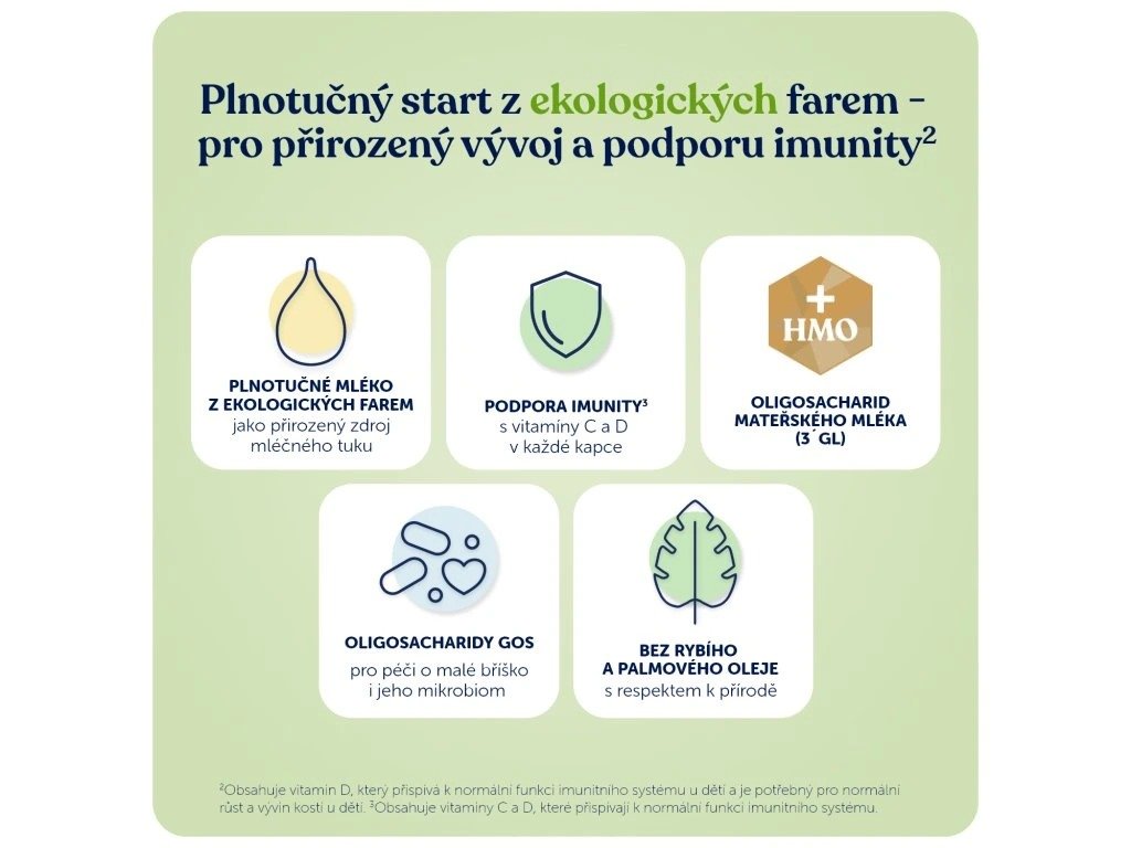 plnotučné MLÉKO (211 g tekutého MLÉKA na 100 g prášku), laktóza (z MLÉKA), syrovátková bílkovina (z MLÉKA), odstředěné MLÉKO, rostlinné oleje (slunečnicový, kokosový, řepkový), galaktooligosacharidy (z MLÉKA), emulgátor: slunečnicový lecitin, citronan sodný, olej z mikrořas Schizochytrium sp., citrát vápenatý, fosforečnan draselný, fosforečnan vápenatý, chlorid draselný, uhličitan vápenatý, vitamin C, chlorid hořečnatý, taurin, pyrofosfát železitý, vitamin E, síran zinečnatý, vitamin D3, niacin, kyselina pantothenová, vitamin A, seleničitan sodný, biotin, vitamin K, thiamin, síran měďnatý, jodid draselný, hydroxid vápenatý, kyselina listová, vitamin B12, vitamin B6, síran manganatý, regulátor kyselosti: kyselina citronová.