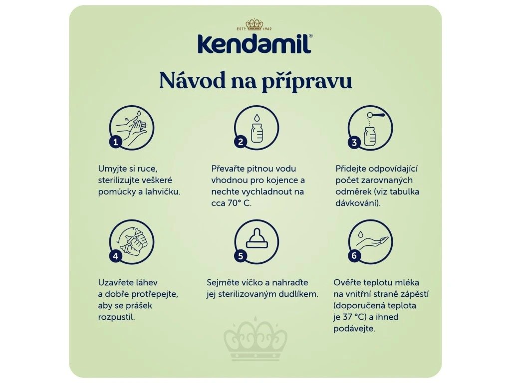Příprava: Před otevřením obalu vždy zkontrolujte, zda není obal poškozený. Pokud byl poškozen, produkt nepoužívejte. Umyjte si ruce a sterilizujte veškeré pomůcky a lahvičku. Převařte kojeneckou vodu a nechte vychladnout na cca 70 °C. Nepoužívejte opakovaně převařovanou vodu. Použijte přiloženou odměrku, přidejte do láhve s vodou odpovídající počet zarovnaných odměrek (zarovnejte prášek v odměrce pomocí ploché části nože – prášek nestlačujte) - viz doporučené dávkování. Láhev uzavřete a dobře protřepejte, aby se prášek rozpustil. Sejměte víčko a nahraďte jej sterilizovaným dudlíkem. Před podáváním ověřte teplotu mléka na vnitřní straně zápěstí (doporučená teplota je 37 °C) a podávejte.