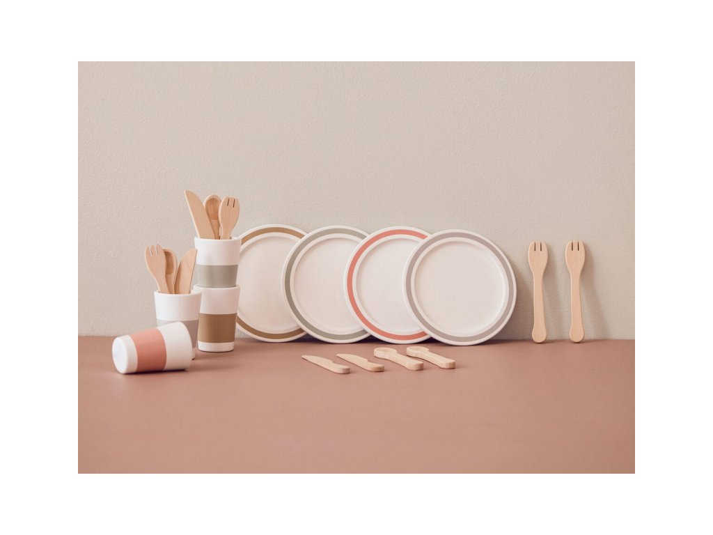 20-dílná jídelní sada je součástí ucelené kolekce dřevěných hraček Kids Concept Bistro.