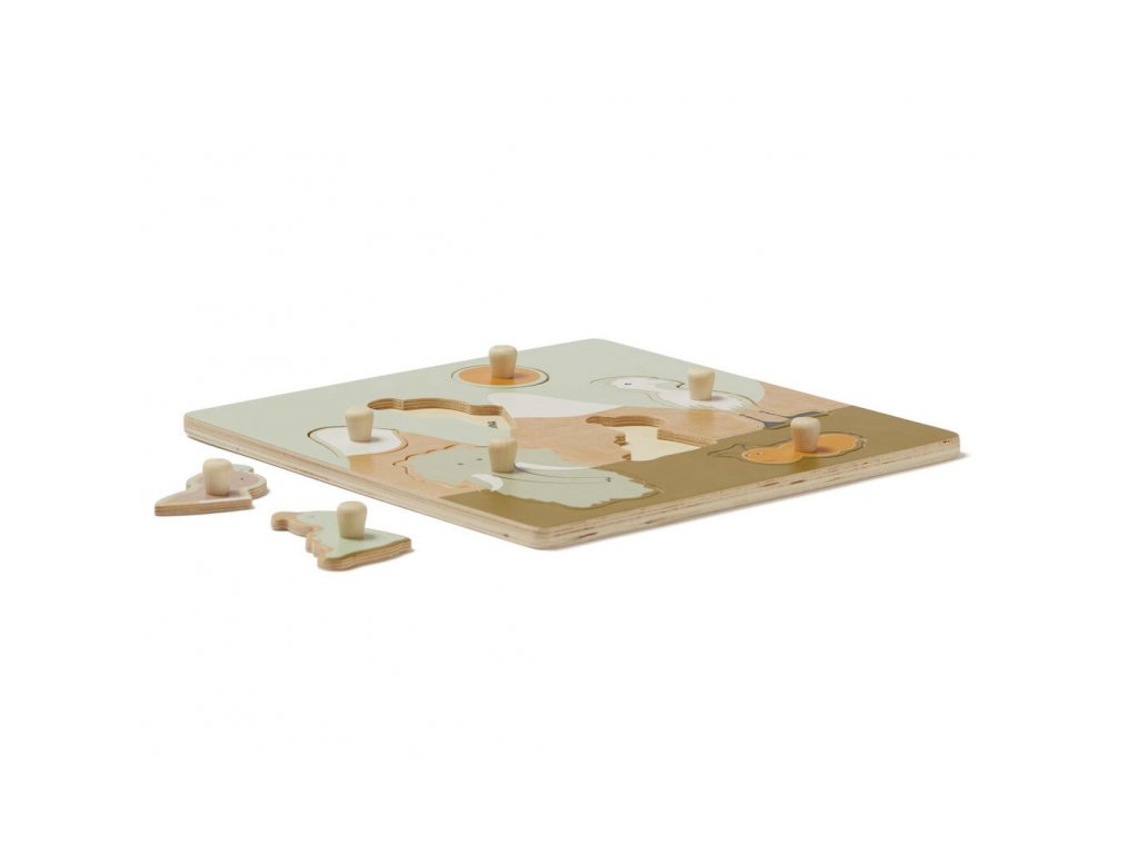 Sedm dřevěných vyjímatelných zvířátek a tvarů je vybaveno úchytkami pro snadné uchopení dětskými ručičkami. Hračka rozvíjí koordinaci ruka / oko a jemnou motoriku dítěte.